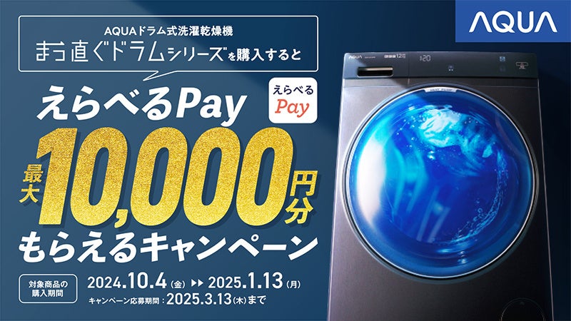 アクア株式会社(本社:東京都中央区、代表取締役社長 兼 CEO:杜 鏡国)は、AQUA ドラム式洗濯乾燥機「まっ直ぐドラムシリーズ」の最新機種をキャンペーン期間中にお買い上げいただいた方を対象に、「えらべるPay最大10,000円分」を応募者全員にプレゼントするキャンペーンを2024年10月4日(金)から開催いたします。