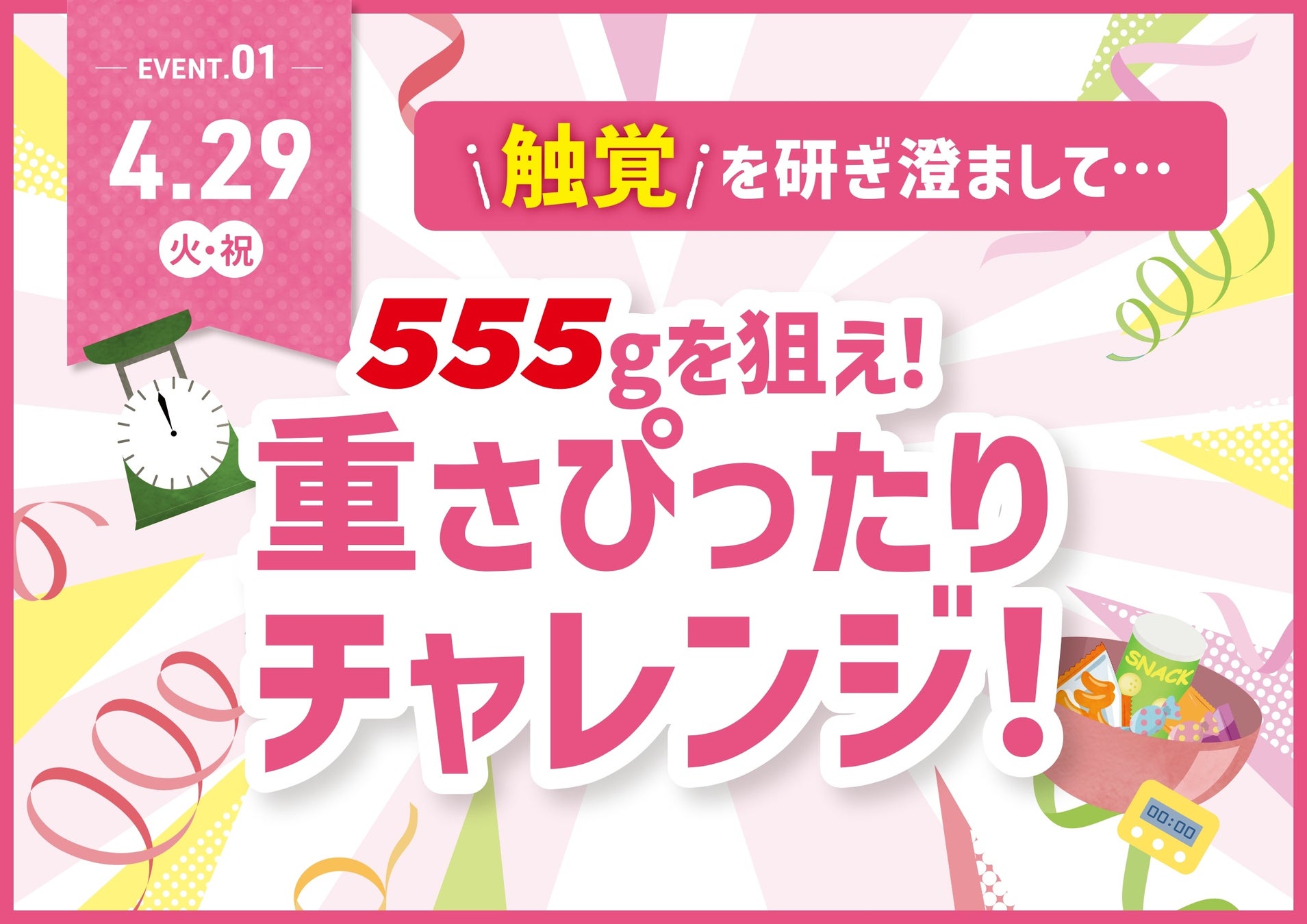 当日の1店舗での購入金額2,000円以上(税込み)のレシート提示で参加可能。お菓子を使って、制限時間内に見事重さを555グラムに合わせると、ピタリ賞で「五反田東急スクエア お食事・お買物券」、ニアピン賞(540~570グラム)で5周年ロゴ入りオリジナルお菓子をプレゼントします