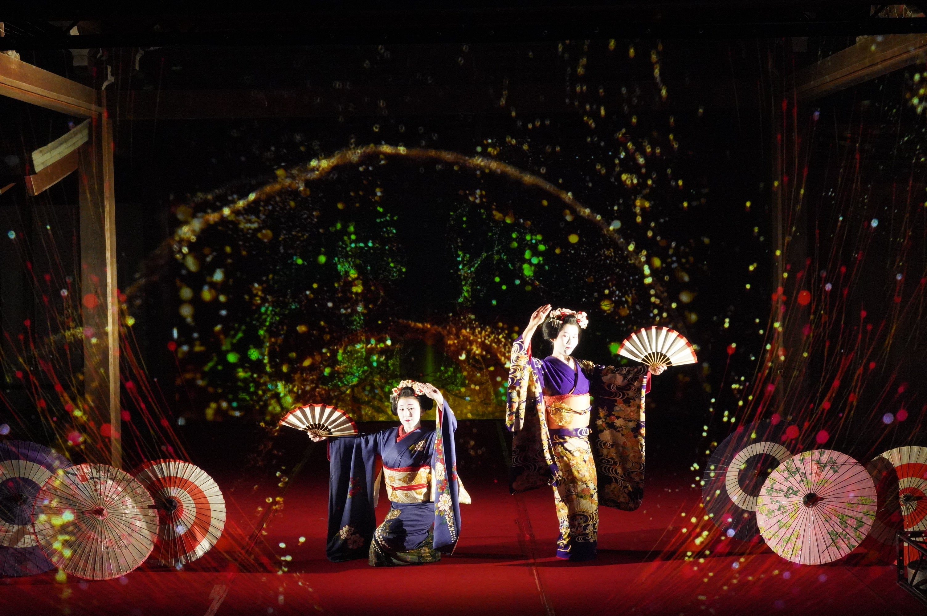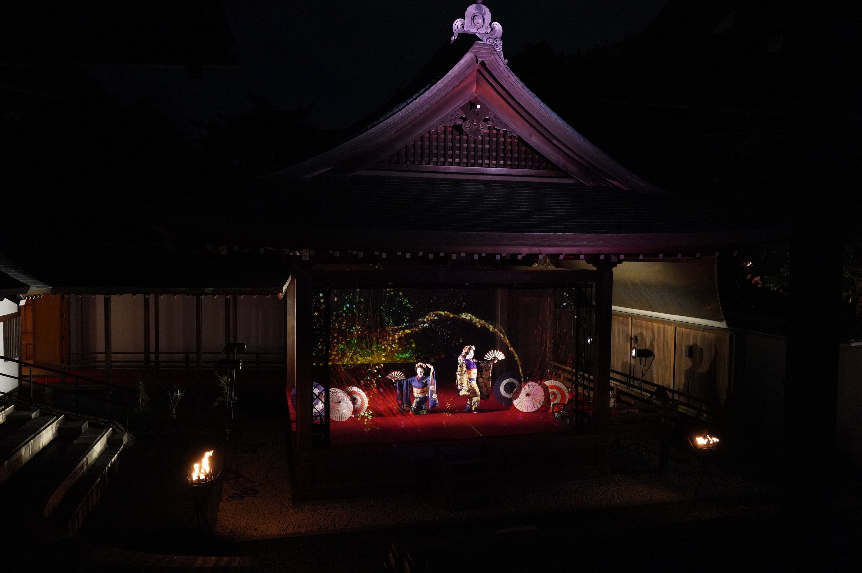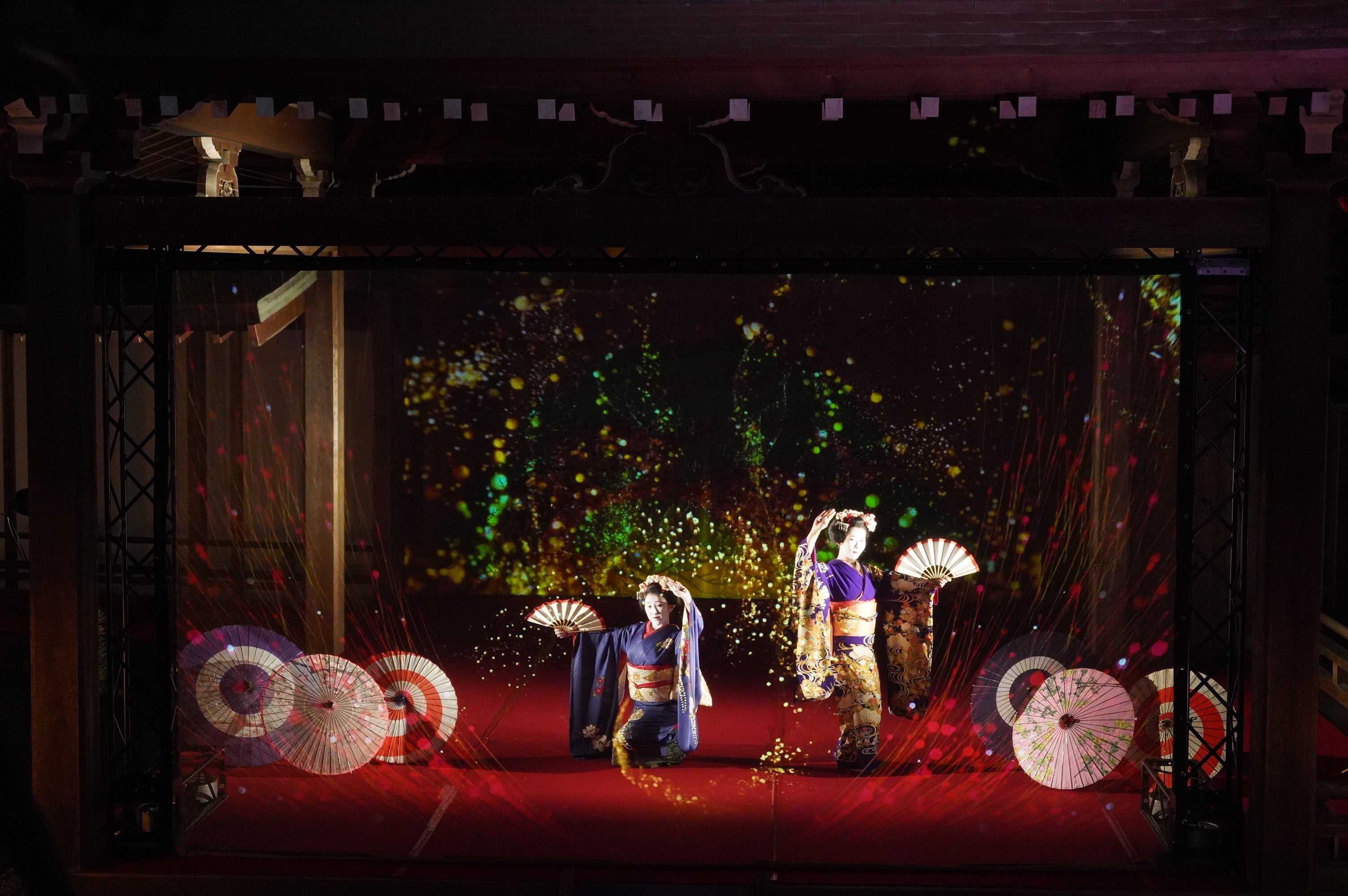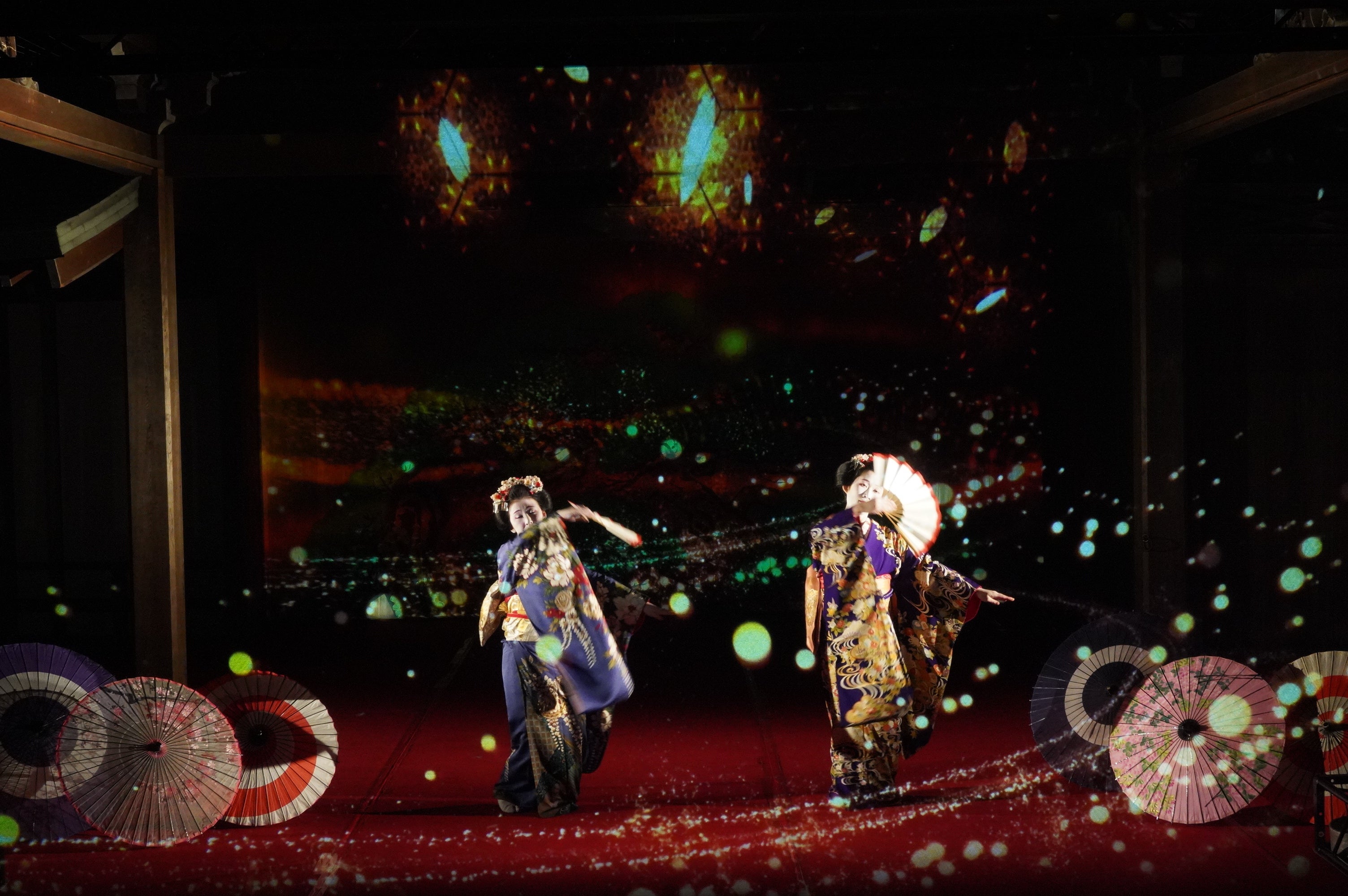 伝統的な構造の能舞台をいかし、能舞台前面のホログラムスクリーンへのプロジェクション映像と老松が描かれた鏡板へのプロジェクション映像、そして本舞台での舞妓による日本舞踊を連動させた演出により、日本の伝統文化とデジタル技術が調和した新しいアート空間の創出を目指しました。
