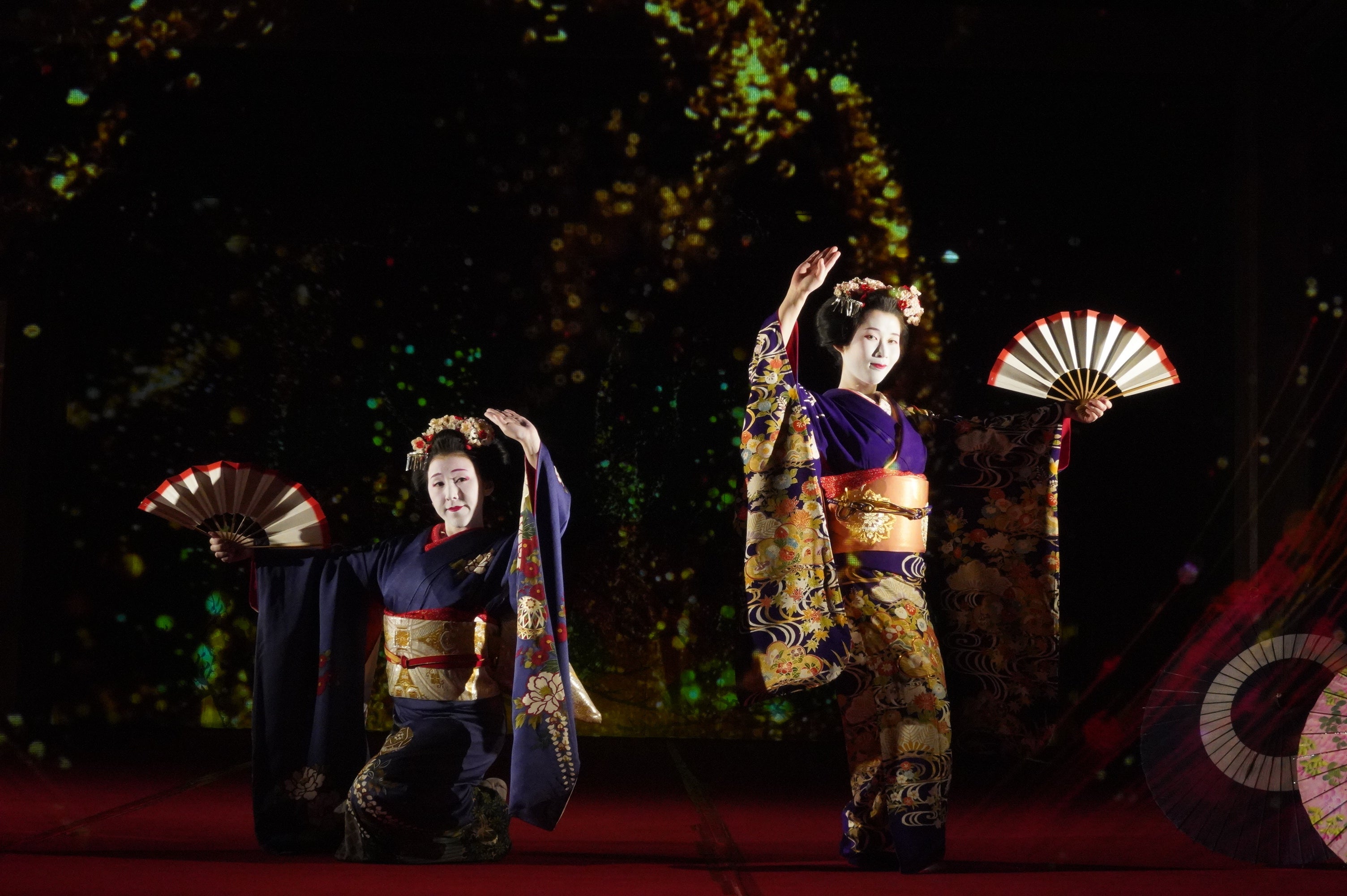 能舞台前面のホログラムスクリーンへの投影映像と老松が描かれた鏡板への投影映像、本舞台での舞妓による日本舞踊を連動させた演出で、日本の伝統文化とデジタル技術が調和した新しいアート空間を創出。
