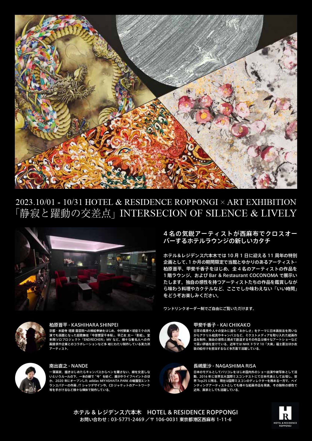 2023年10月1日(日)~10月31日(火)、ホテル&レジデンス六本木の1階ラウンジ、およびBar&Restaurant COCONOMAにて4名の気鋭アーティストの作品を展示します。