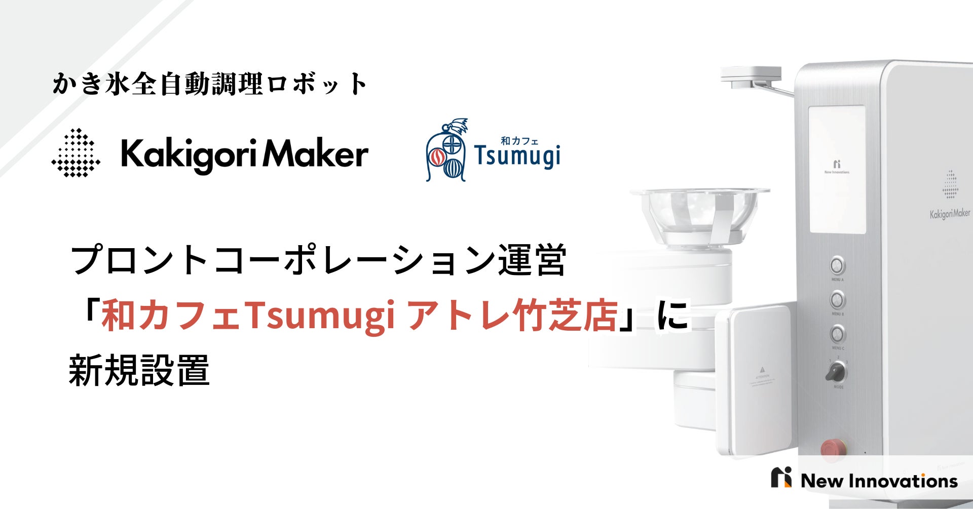 株式会社New Innovations(本社:東京都江東区、代表取締役CEO兼CTO:中尾 渓人、以下「New Innovations」)は、株式会社プロントコーポレーション(本社:東京都港区、代表取締役社長:杉山 和弘)が運営する「和カフェ Tsumugi アトレ竹芝店」に、かき氷機と自動連携する全自動調理ロボット「Kakigori Maker」を新たに導入したことをお知らせいたします。