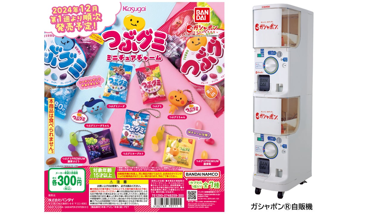 春日井製菓株式会社(本社:愛知県名古屋市西区、代表取締役社長 春日井大介、以下 春日井製菓)のグミブランド「つぶグミ」が、株式会社バンダイの製造・販売するオリジナルカプセルトイブランド「ガシャポン®」に登場します。「つぶグミ」シリーズとブランドキャラクター「つぶグミちゃん」がミニチュアになった『つぶグミ ミニチュアチャーム』(全7種)は、2024年12月第2週から順次、全国のガシャポンバンダイオフィシャルショップ、玩具売場、量販店、家電店などに設置されたガシャポン®自販機シリーズにて発売されます。 (「ガシャポン®」 は、株式会社バンダイのオリジナルカプセルトイブランドです。 )