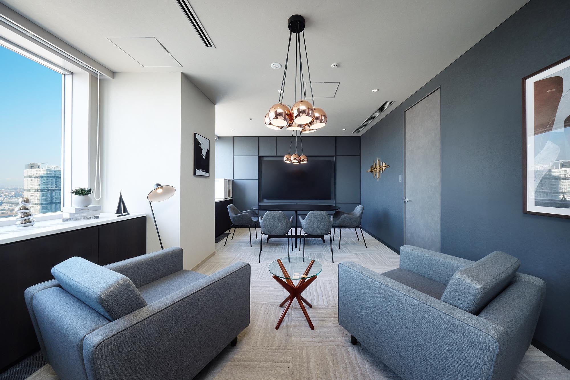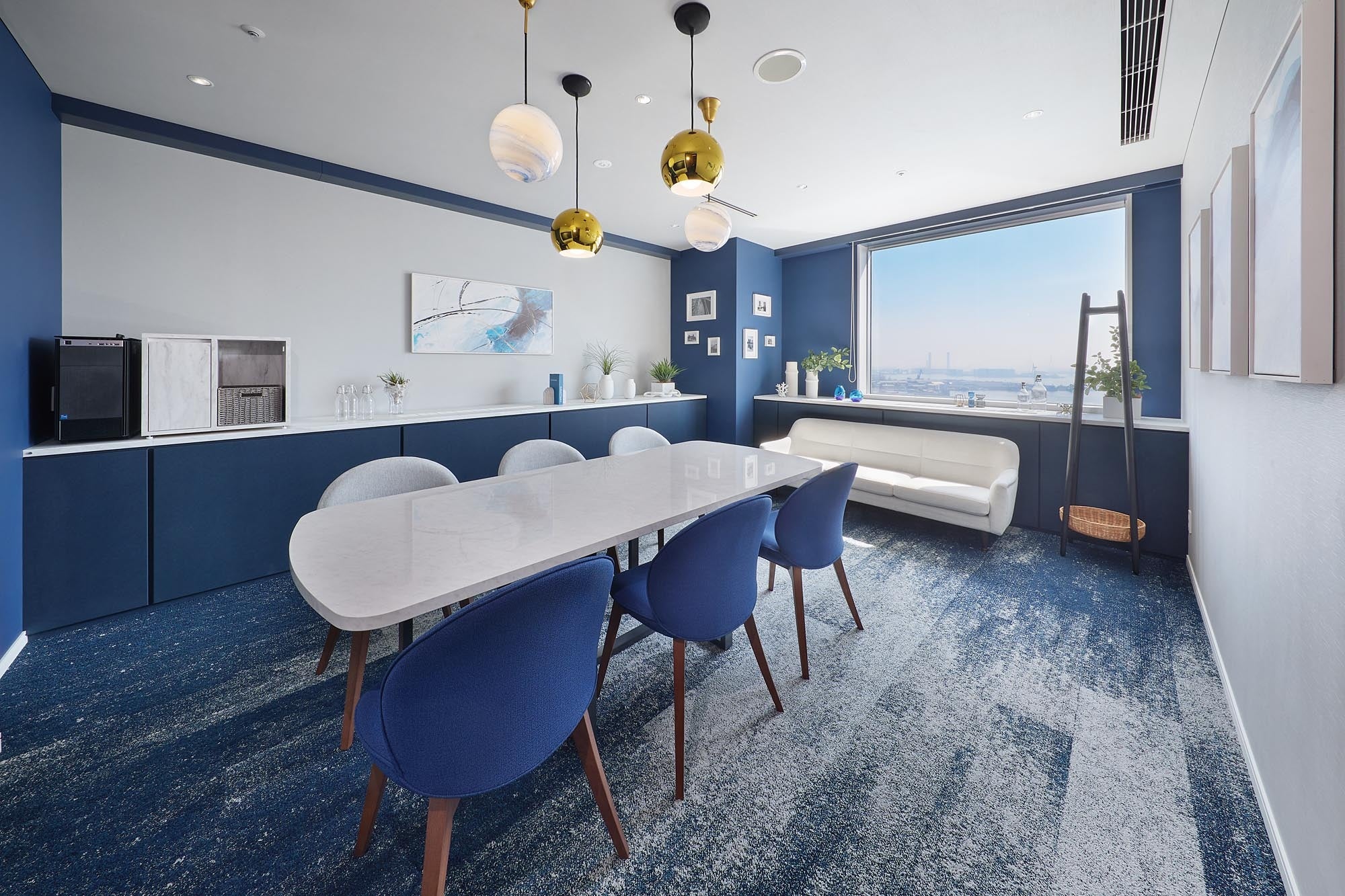 デザインは、「横浜の伝統と革新を体現する、洗練のマンションギャラリー。」をコンセプトに、住まい選びの時間が上質な時間となるよう、ホテルのラウンジのようなラグジュアリーな空間をイメージしました。ギャラリー内は横浜のイメージを体現したデザインを施し、ブルーを基調とした落ち着いた空間です。