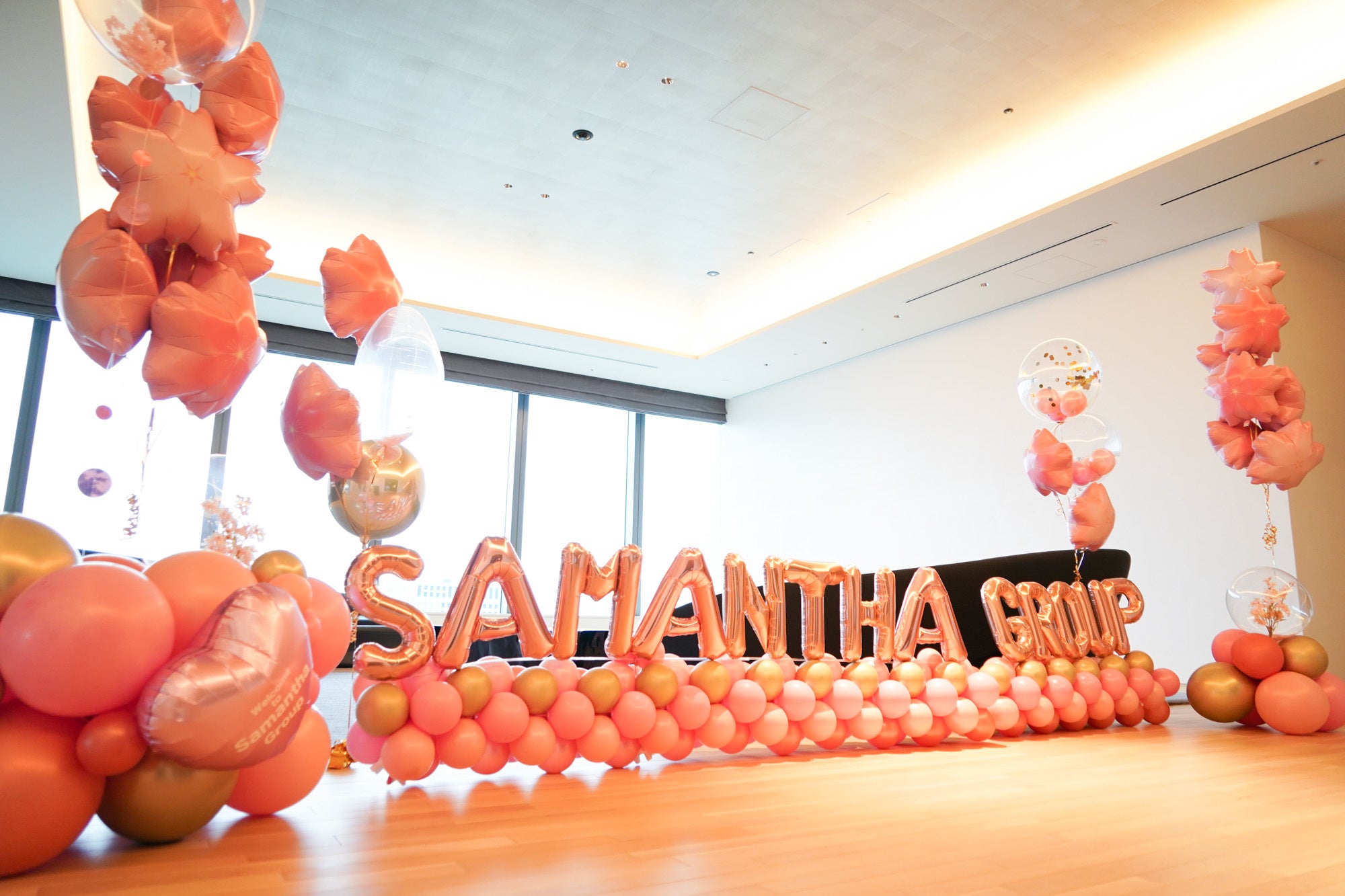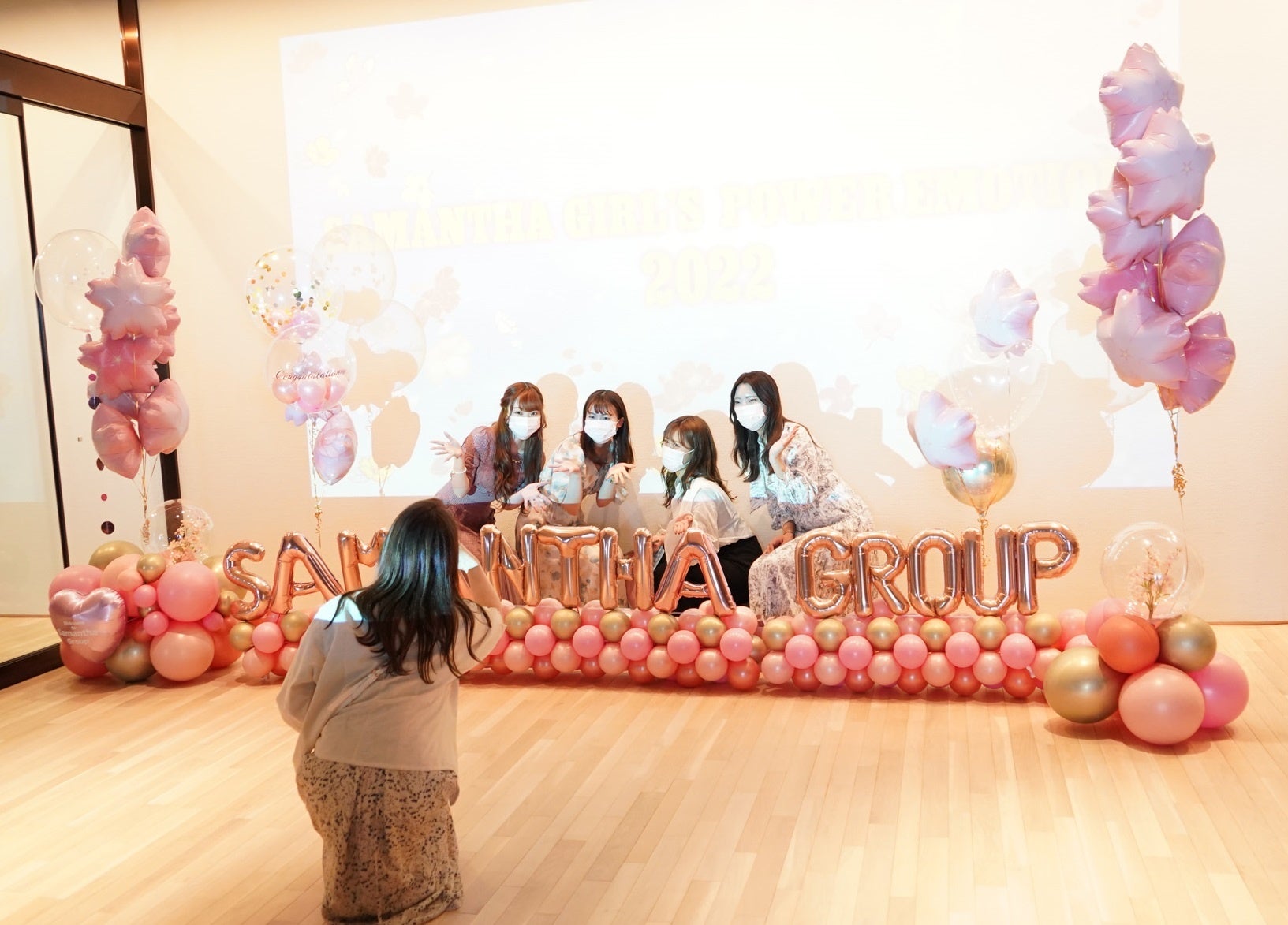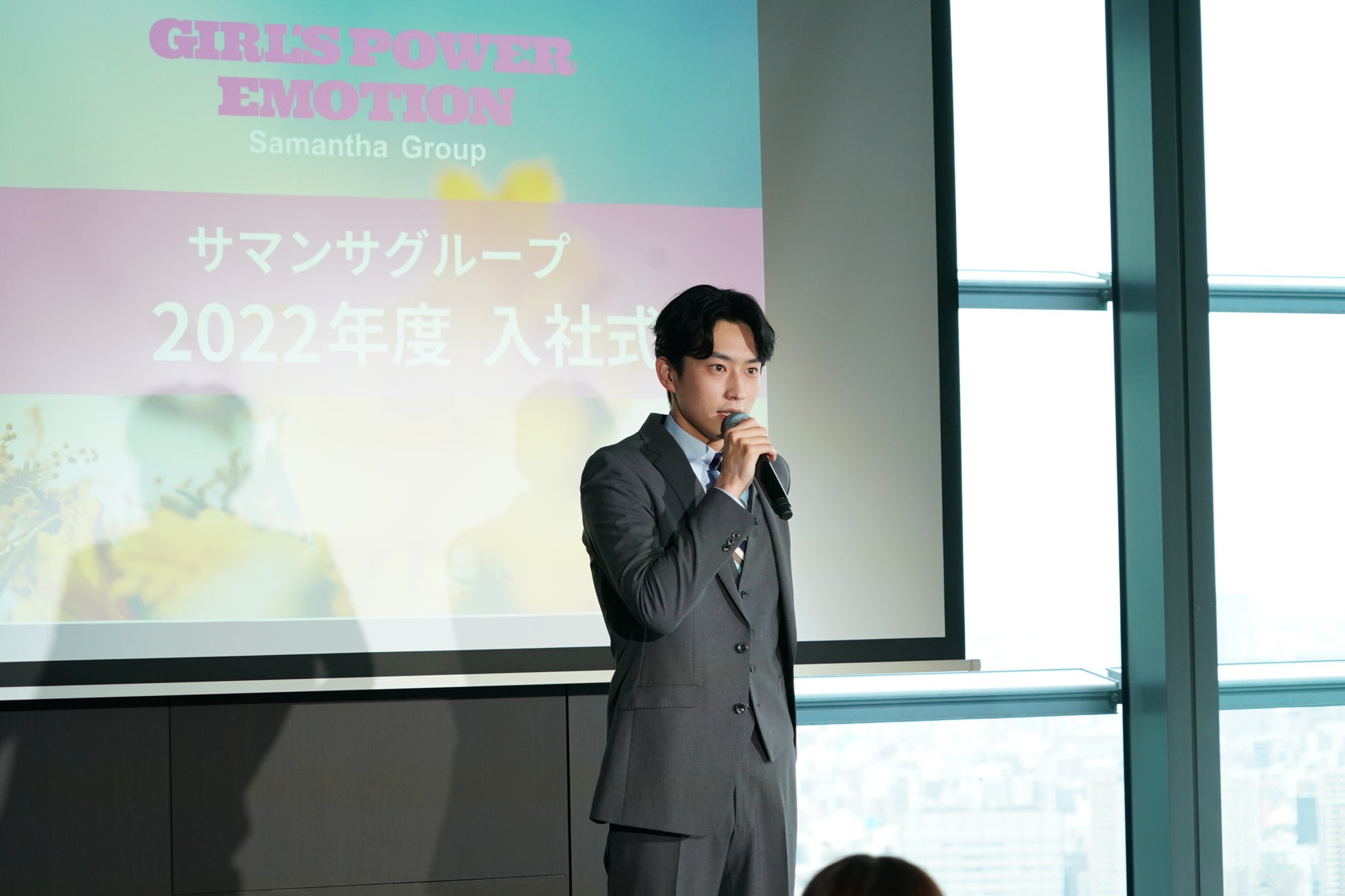渡辺美優紀さんや高橋メアリージュンさん、ryuchellさんなどからのお祝いムービー、サマンサ女子によるダンスの披露、プロモーショナルモデルを務める杉野遥亮さんのサプライズ登場、先輩社会人である杉野さんと新入社員とのQ&Aコーナー、最後には杉野さんと新入社員の集合写真撮影にて、3年ぶりのオフライン開催となる2022年度入社式を華やかに締めくくりました。