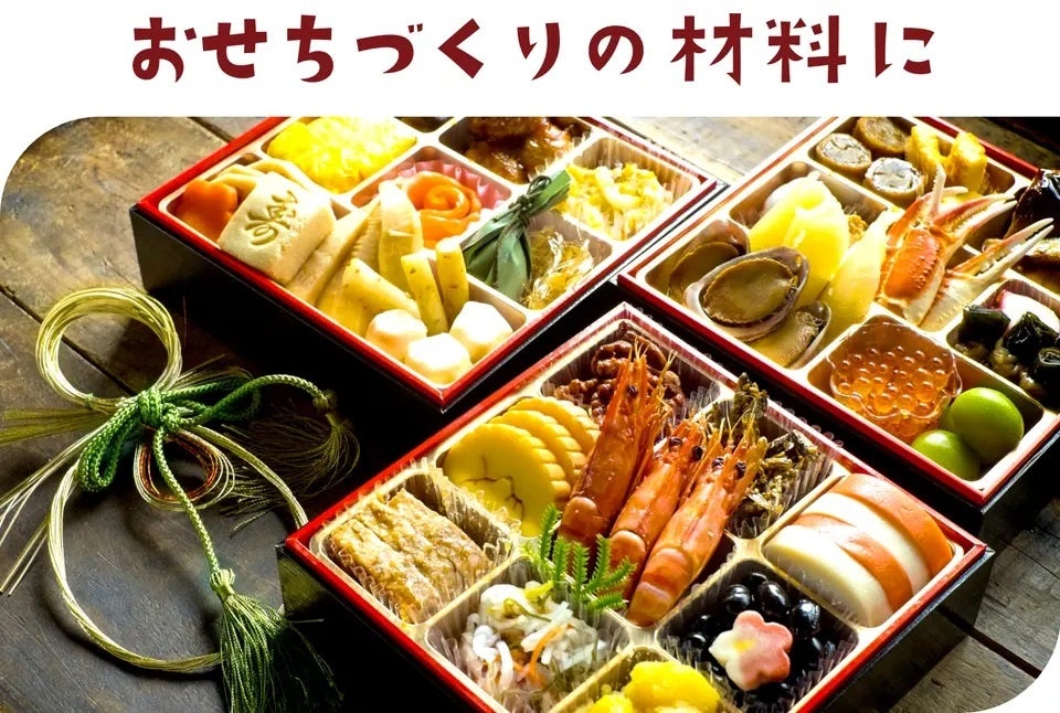 ”元気・丈夫・健康な生活を願う”「黒豆」、“立身出世を願う”「鰤」、“新しい年の順風満帆を願う”「帆立」といったおせち料理に人気の縁起物が沢山あります。