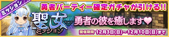 開催期間中に【聖女アバター】を1個入手する毎に、『勇者パーティー確定ガチャ』で、超激レアな頭身姿のカワイイ彼を100%獲得できる♪ミッションです!