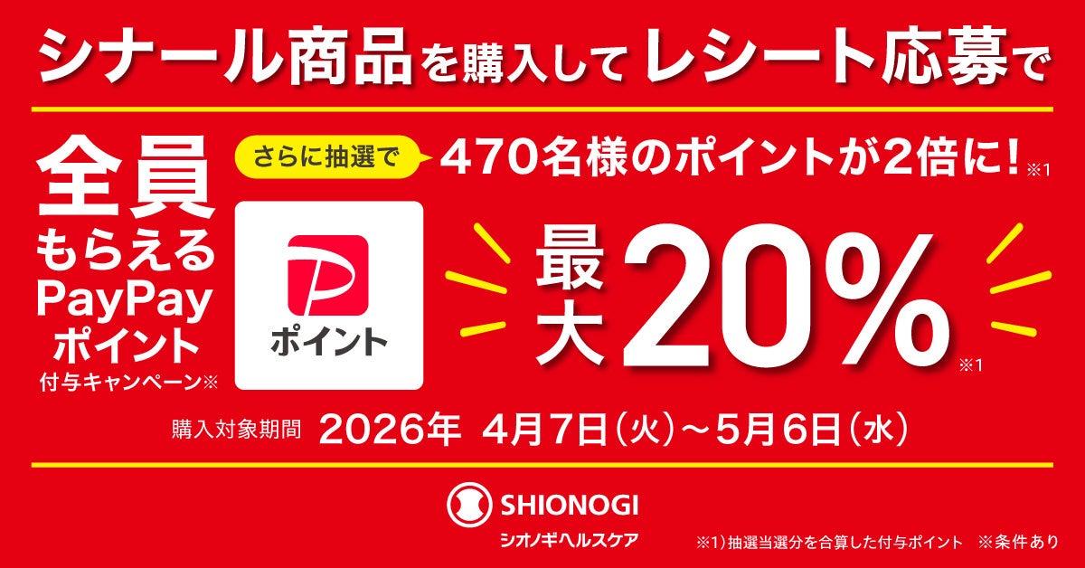 ヘルスケア価値の提供を通じて社会に貢献するシオノギヘルスケア株式会社(本社:大阪府大阪市、代表取締役社長:中川 ゆう子、以下「シオノギヘルスケア」)は、ビタミンC医薬品ブランド「シナール」のPayPayポイント付与キャンペーンを2026年4月 7 日~5月6日にて開催します。