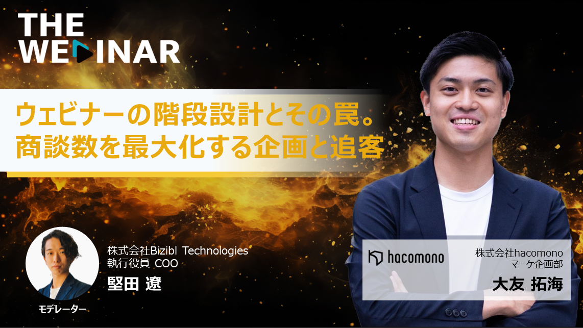第9弾企画は、株式会社hacomonoの大友氏をゲストに迎え、「ウェビナーの階段設計とその罠。商談数を最大化する企画と追客」というテーマでお届けします。