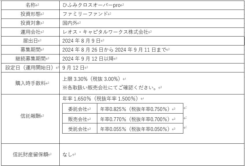 SBIレオスひふみ株式会社の傘下で投資信託「ひふみ」シリーズを運用するレオス・キャピタルワークス株式会社(本社:東京都千代田区、代表取締役社長:藤野 英人、以下「当社」)は、主に成長が期待できる国内外の未上場株式と上場株式を投資対象とするアクティブ運用の公募投資信託「ひふみクロスオーバーpro」を新規設定いたします。「ひふみクロスオーバーpro」は未上場株式と上場株式の境界を越えた投資を意味するクロスオーバー投資を実現することで、日本のスタートアップ企業が上場後に伸び悩む“死の谷”の解消を目指します。本投資信託を通じて、個人では難しい未上場企業への投資が可能となります。また、NISA成長投資枠の要件を満たすファンドとなります。