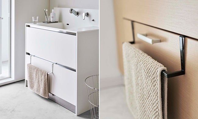 吊り下げ部分が長いので、バスマットを衛生的な低位置に設置でき、引き出しの取っ手を避けて使用できます。