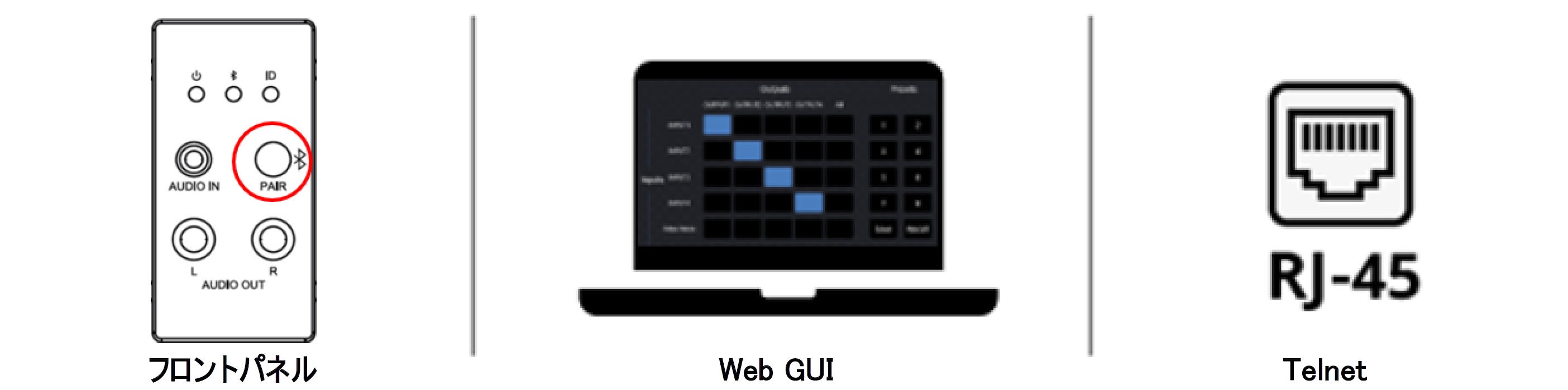 多彩な制御方法に対応しており、フロントパネルのボタン操作で入力ソースの切り替えが出来るほか、Web GUIやAPIコマンドを使用して入力ソースの切り替えはもちろん、入力感度や出力ゲインを各16段階で調整できるなど様々な設定が可能です。