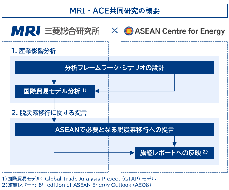 MRIは、これまでの国内外における脱炭素関連の政策立案・事業支援の経験と、エネルギー・経済モデルを用いた独自の定量分析の知見を活用し、ACEはASEAN地域の実情を踏まえた専門知見を提供します。両者の強みを融合させることで、ASEAN地域で必要となる脱炭素移行に関する共同研究を進めます。