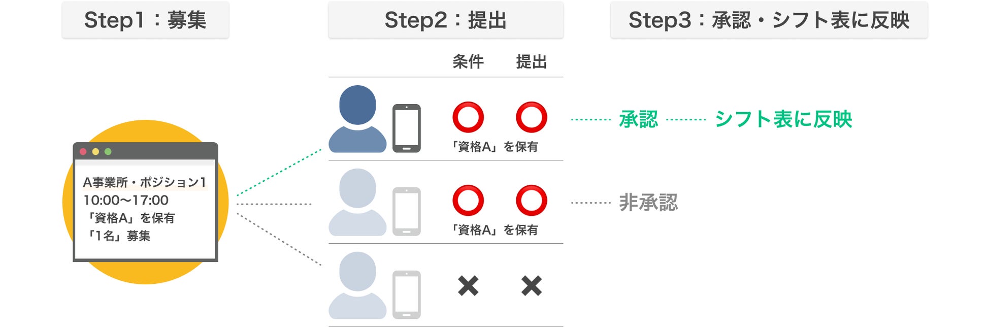 シフトの空きが生じた際、これまでは、スタッフ一人ひとりに直接声をかけて、追加のシフト交渉を行わなければならず、シフトが埋まるかどうかはシフト作成者とスタッフの人間関係や交渉スキルが大きく影響していました。