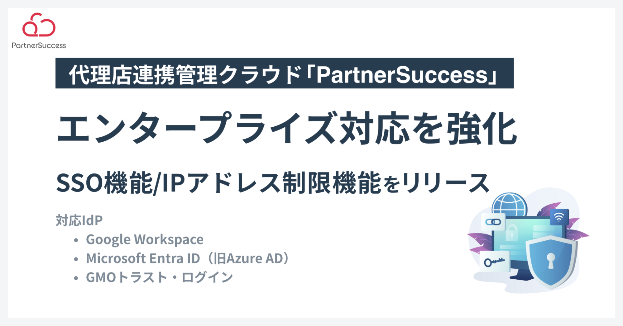 代理店連携管理クラウド「PartnerSuccess」を提供するパートナーサクセス株式会社は、エンタープライズ向けのセキュリティ対応強化の一環として、シングルサインオン(SSO)とIPアドレス制限の機能を新たに実装いたしました。これにより、ユーザーはより安全かつ効率的にPartnerSuccessを利用することが可能となります。