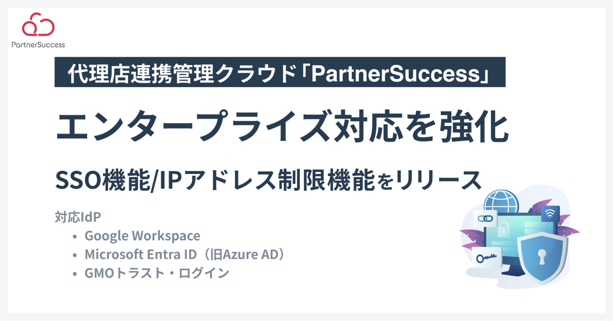代理店販売で業績を伸ばすPRM(※1)-代理店連携管理クラウド「PartnerSuccess」を開発運営するパートナーサクセス株式会社(本社:東京都港区、代表取締役 永田雅裕、以下「パートナーサクセス」)は、「PartnerSuccess」において、SSO機能およびIPアドレス制限機能をリリースしました。