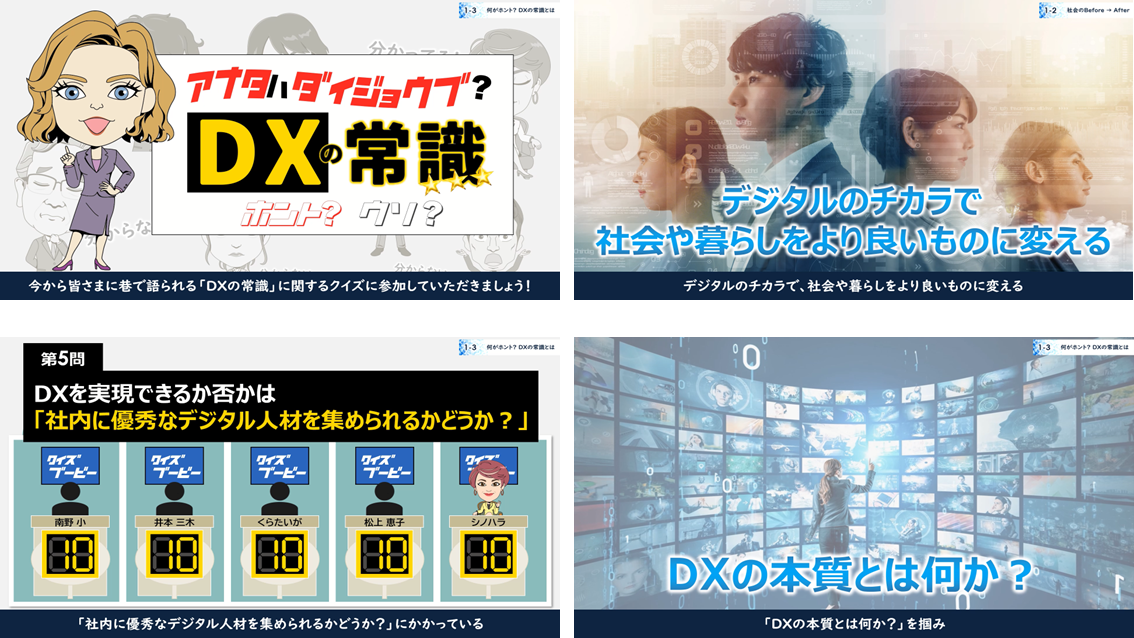 DXの本質と全体像をリアルにつかめる全社員向けeラーニングです。まだDXについてあまり理解していない社員の学習への動機づけに活用いただけます。ポップで印象的なアニメーションを用い、デジタルに苦手意識のある社員の取組みやすいのが特徴です。インプットだけでなく、各章で「自分の立場に置き換えるなら」というアンケートに回答してもらうことで、理解度促進と行動変容を促す設計となっています。