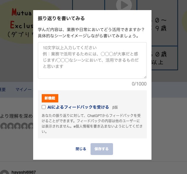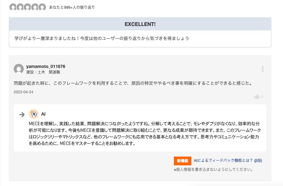 今回実装されたのは、ChatGPTに学習させたGLOBIS 学び放題のデータをもとに、AIがユーザーにフィードバックを行う機能です。コースの受講を終えると、ユーザーには振り返りコメントの入力欄が表示されます(図1)。「AIからフィードバックを受ける」というチェックボックスにチェックを入れてコメントを保存すると、自身が入力したコメントの下にAIからのフィードバックが表示されます(図2)。