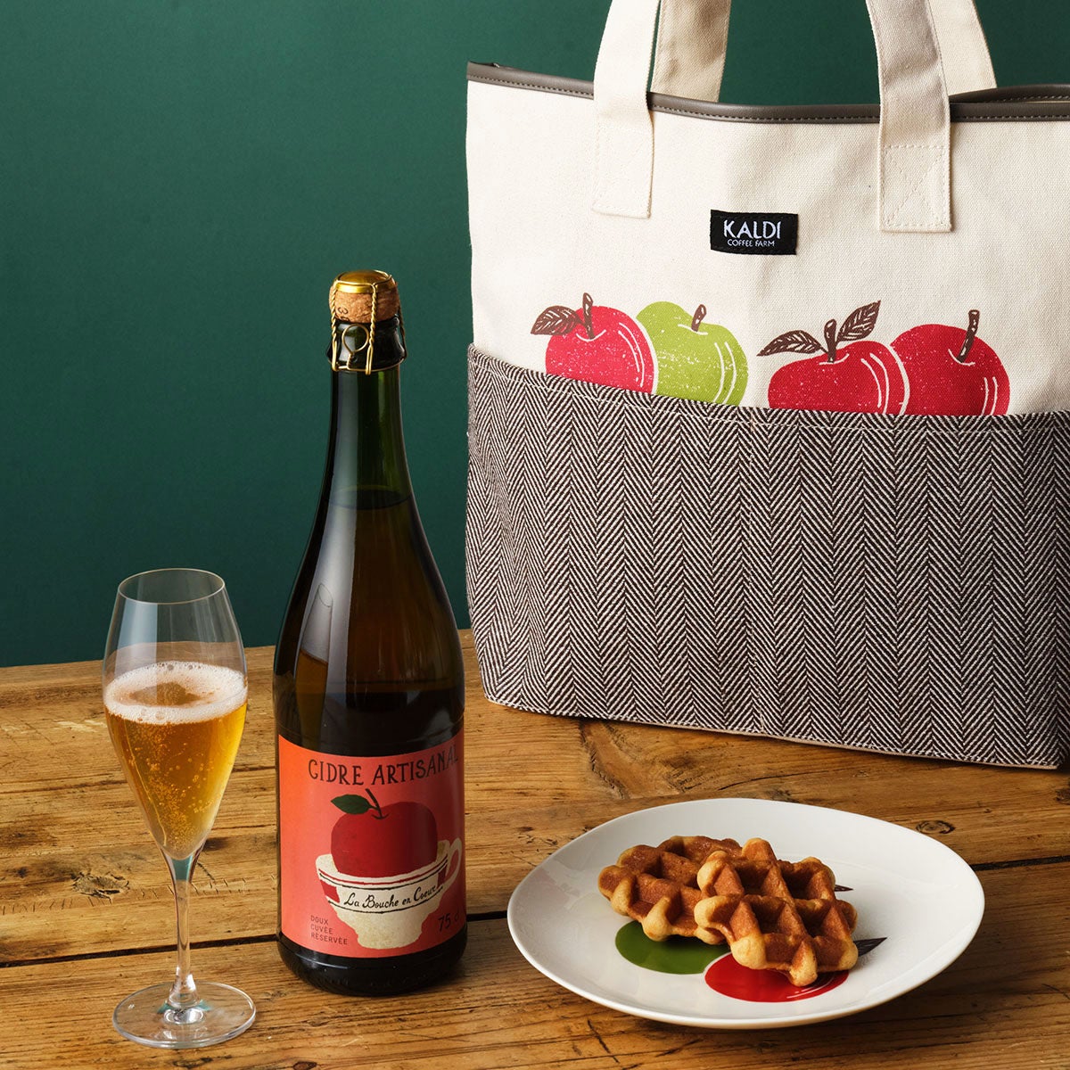 厳選された3種類のリンゴのみを使用したバッグ限定のシードル「ラ・ブーシュ・オン・クール シードル・アルティザン・ドゥー(甘口)」、キャラメルソース入りの生地に密漬けりんごを練りこんだ「キャラメル&アップル ワッフル」、色鮮やかなりんごが描かれた「ガレット皿」をバッグにセットしました。秋らしい色合いのヘリンボーン柄ポケットがついた大きめのりんごバッグは秋の行楽にもおすすめ!