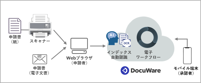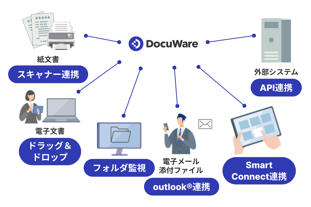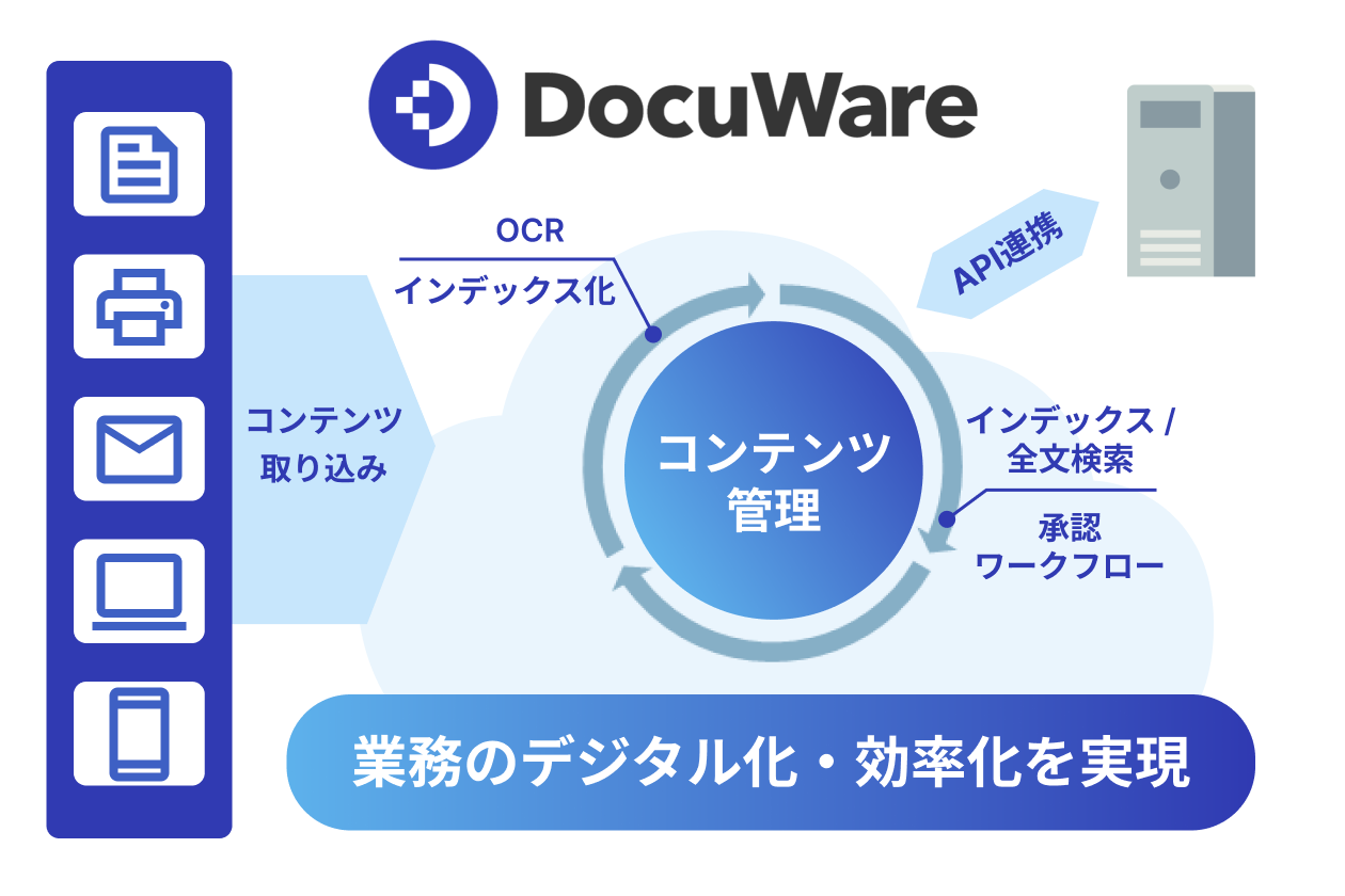 業務のデジタル化・効率化を実現するための機能(OCR、ワークフロー、外部システム連携など)を標準搭載したクラウド型のCSPです。スキャナーをはじめ、E-mailやモバイルデバイスからもDocuWareへダイレクトにデータを取り込み自動で文字データ化、ワークフロー処理して一元管理・共有することが可能です。