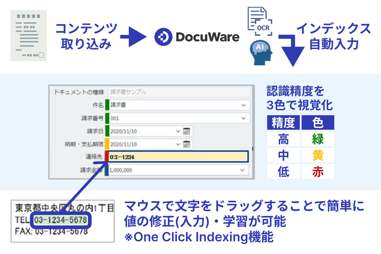 DocuWareに取り込まれた文書はOCR処理が実行されます。ドキュメントの分類、検索に必要なインデックス情報の取得を自動的に行いますので、1つ1つ手入力していた登録の手間とヒューマンエラーを大幅に軽減できます。