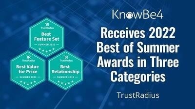 東京発(2022年8月10日)– セキュリティ意識向上トレーニングとフィッシングシミュレーション・分析を組み合わせた世界最大の統合型プラットフォームのプロバイダーであるKnowBe4(本社:米国フロリダ州タンパベイ、創立者兼CEO:Stu Sjouwerman (ストゥ・シャワーマン))は、テクノロジー購入者のためのソフトウェア/テクノロジー・レビューサイトのTrustRadiusから2022年度夏季の3つの「Best」賞(「Best Value for Price」、「Best Relationship」、「Best Feature Set」)をすべて受賞したことを発表します。