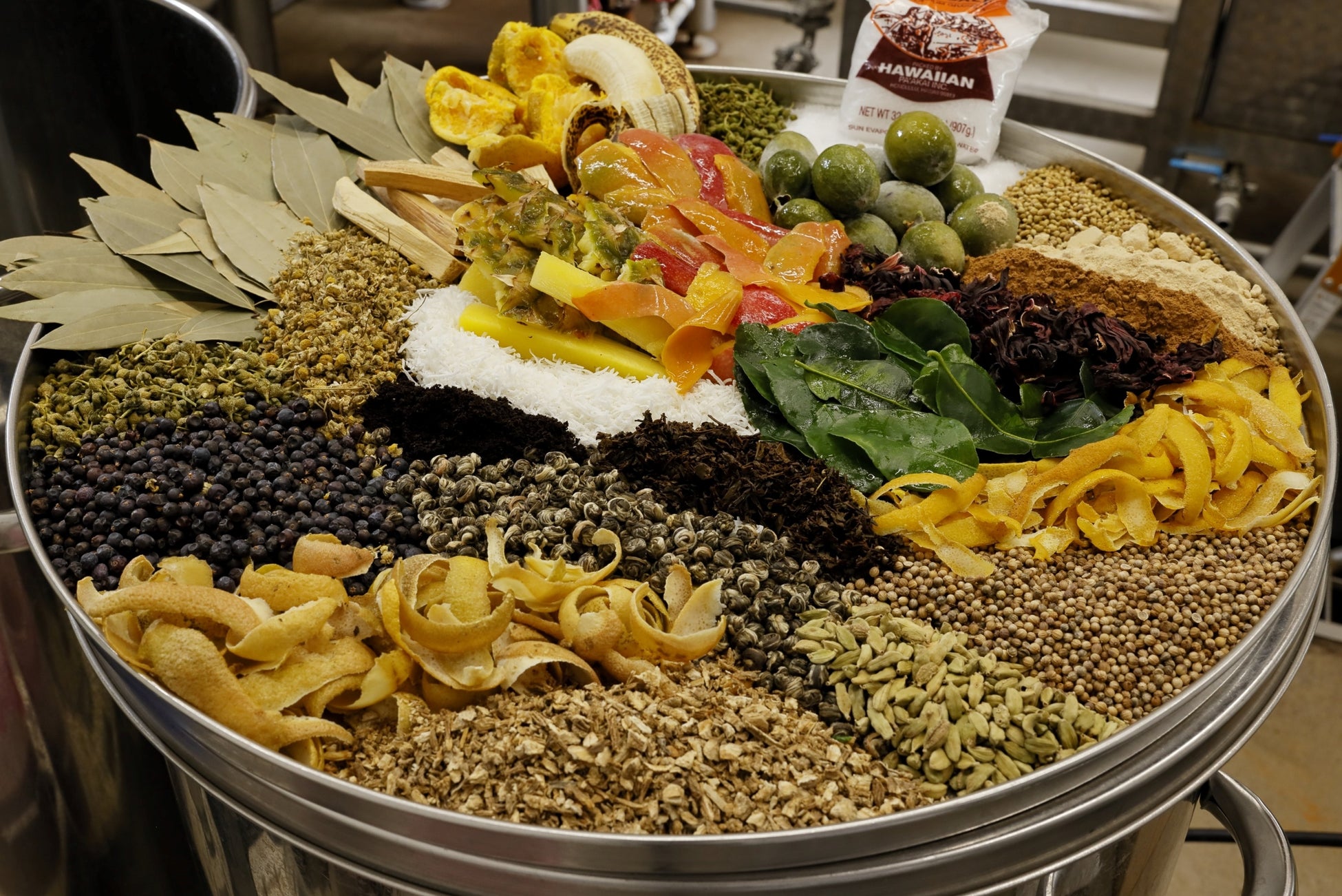 ボタニカル:ジュニパーベリー、コリアンダーシード、アンジェリカルート、オリスルート、レモンピール、オレンジピール、ベルガモットピール、カモミール、フェイジョア、バナナ、ローゼル、ジャスミン茶、パロサント、ココナッツ、シナモンリーフ、パッションペッパー、カフィアライムリーフ、山椒、カルダモン、塩(ハワイ産)、りんご、マンゴー、パイナップル、コーヒー粉、紅茶の茶葉