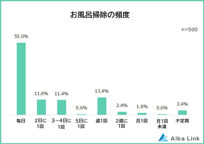 全国の男女500人にお風呂掃除の頻度を聞いたところ、「毎日」と答えた人が55.0%で半数を超えました。こまめに掃除している人が多いようですね。