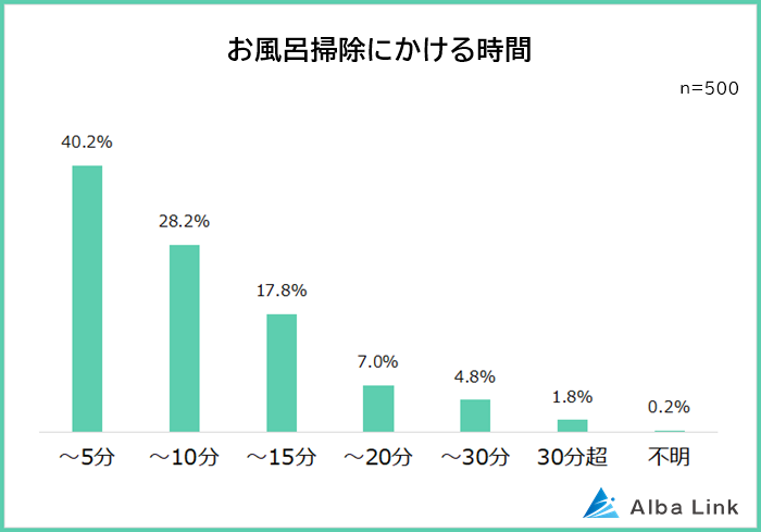 お風呂掃除にかける時間でもっとも多かった回答は「~5分(40.2%)」で、全体の4割を占めました。「~10分」「~15分」と時間が長くなるほど回答数は減っており、お風呂掃除は短時間で終わらせる人が多いとわかります。