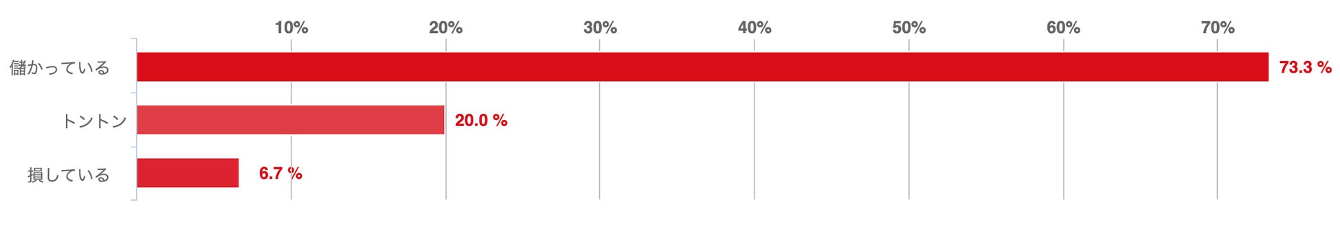 アンケートによれば、「儲かっている」が73.3%と大多数を占める結果となった。一方で「トントン」、すなわち損失と利益が相殺されている人は20.0%、「損している」人は6.7%に留まった。