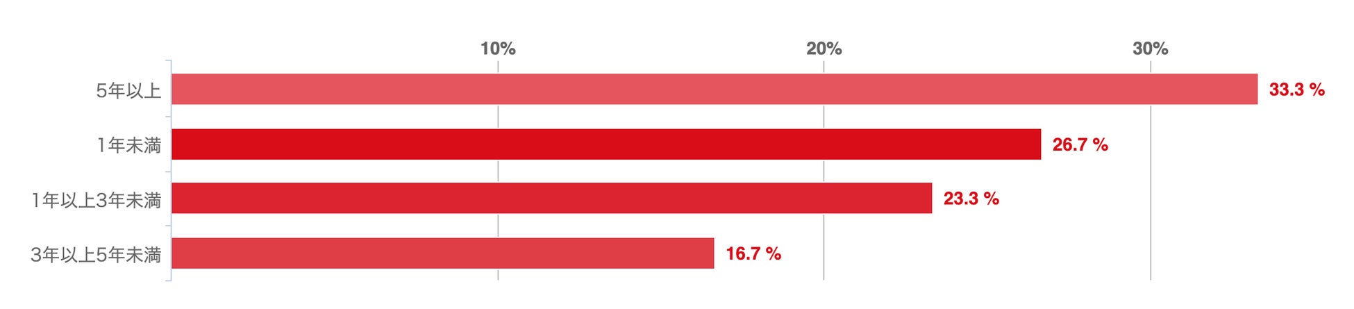 60代の投資信託の運用経験は「5年以上(33.3%)」が最も多く、そこから「1年未満(26.7%)」、「1年以上3年未満(23.3%)」、「3年以上5年未満(16.7%)」が続く形となった。ここから、60代の投資家には経験者と初心者が入り混じっている様子が伺える。