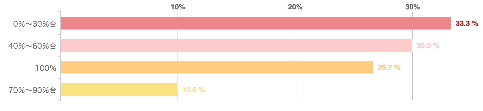 アンケートによれば、「0%〜30%台」が33.3%で最も多くなった。次いで、「40%〜60%台」が30.0%、「100%」が26.7%、「70%〜90%台」が10.0%となっている。