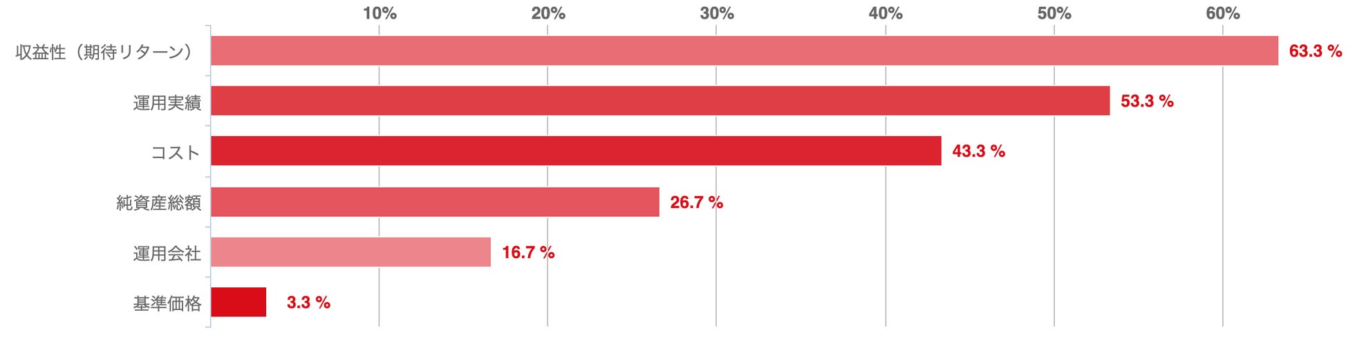 さらに、「純資産総額(26.7%)」や「運用会社(16.7%)」を判断基準とする人も一定数おり、ファンドの安定性や運用主体の信頼性を評価する姿勢も読み取れた。
