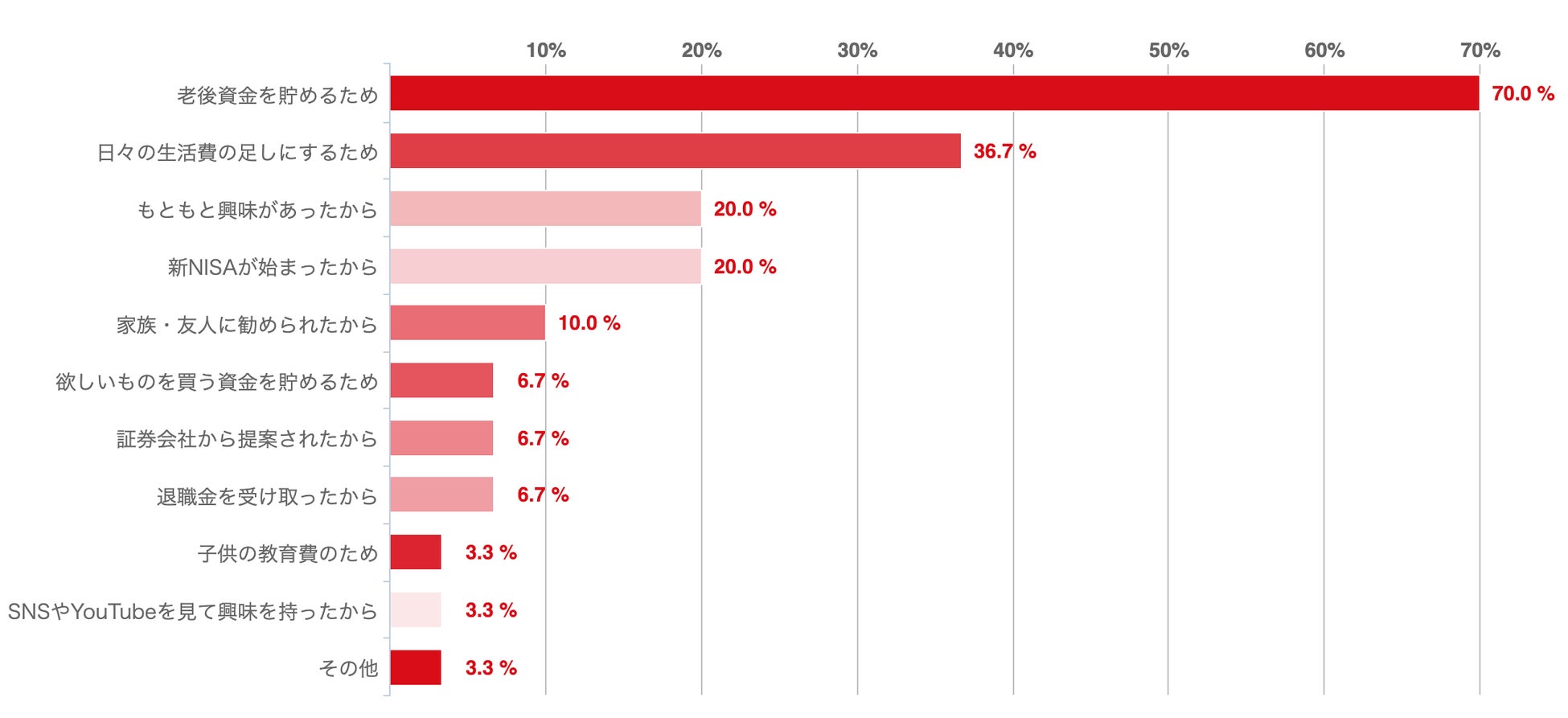次いで「日々の生活費の足しにするため」が36.7%、また「もともと興味があったから」と「新NISAが始まったから」がそれぞれ20.0%で並んだ。