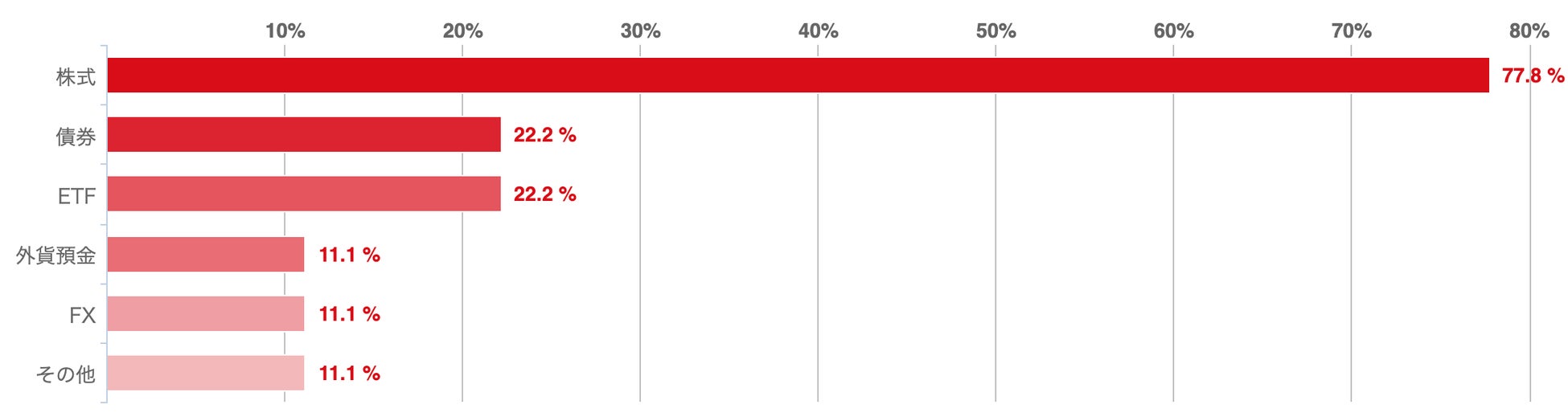 アンケートによれば、「株式」に投資している人の割合が77.8%で圧倒的に高く、これに「債券」と「ETF」がそれぞれ22.2%で続く形となった。また、「外貨預金」や「FX」、「その他(純金積立)」と回答した人も11.1%ずついた。