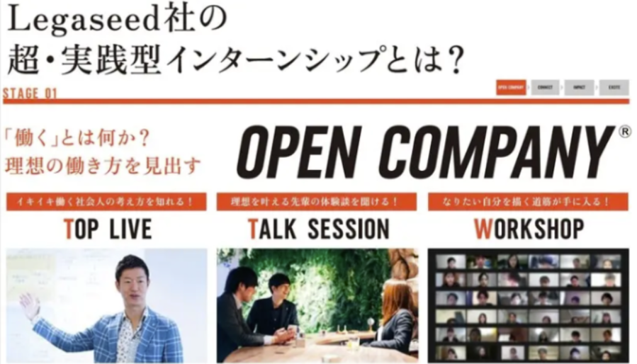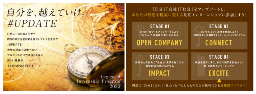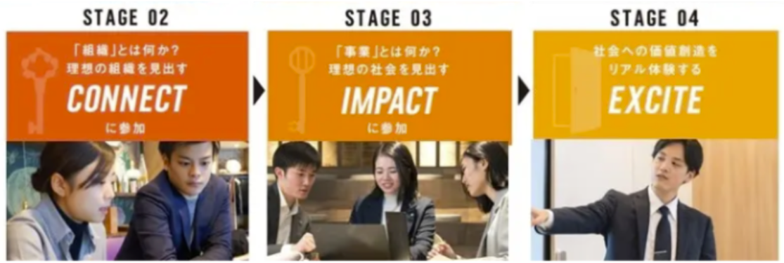 また、インターンシップでは4つのステージを設け、理想の働き方、生き方を見つける機会から、会社経営において重要な「組織」と「事業」両方の理想を実現するためのスキルを磨き、力量を試す機会まで段階的に成長を感じられるフローを企画しています。