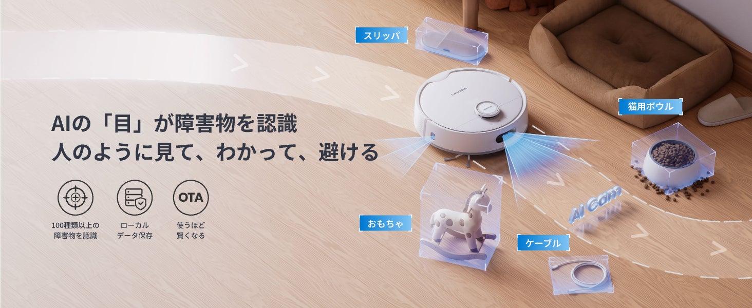 とくに視覚認識による「AIカメラ障害物回避」では、電源コードやスリッパ、体重計、さらにはペットのフンまで「目で見て」識別。AIが瞬時に位置を把握し、家具の脚が入り組んだ場所でもスムーズに潜り込んでどんどんお掃除します。側面に内蔵されたPSD距離センサーが周囲との距離を細かく計測し、ぶつかることなくギリギリまで寄って行けるのもポイント。ベッド下などの暗い場所ではLEDライトが自動で点灯し、玄関先や階段に差し掛かれば段差センサーが作動します。段差は2cmまで乗り越え可能。「ちゃんと掃除してくれないロボット」への不満をぐっと減らします。