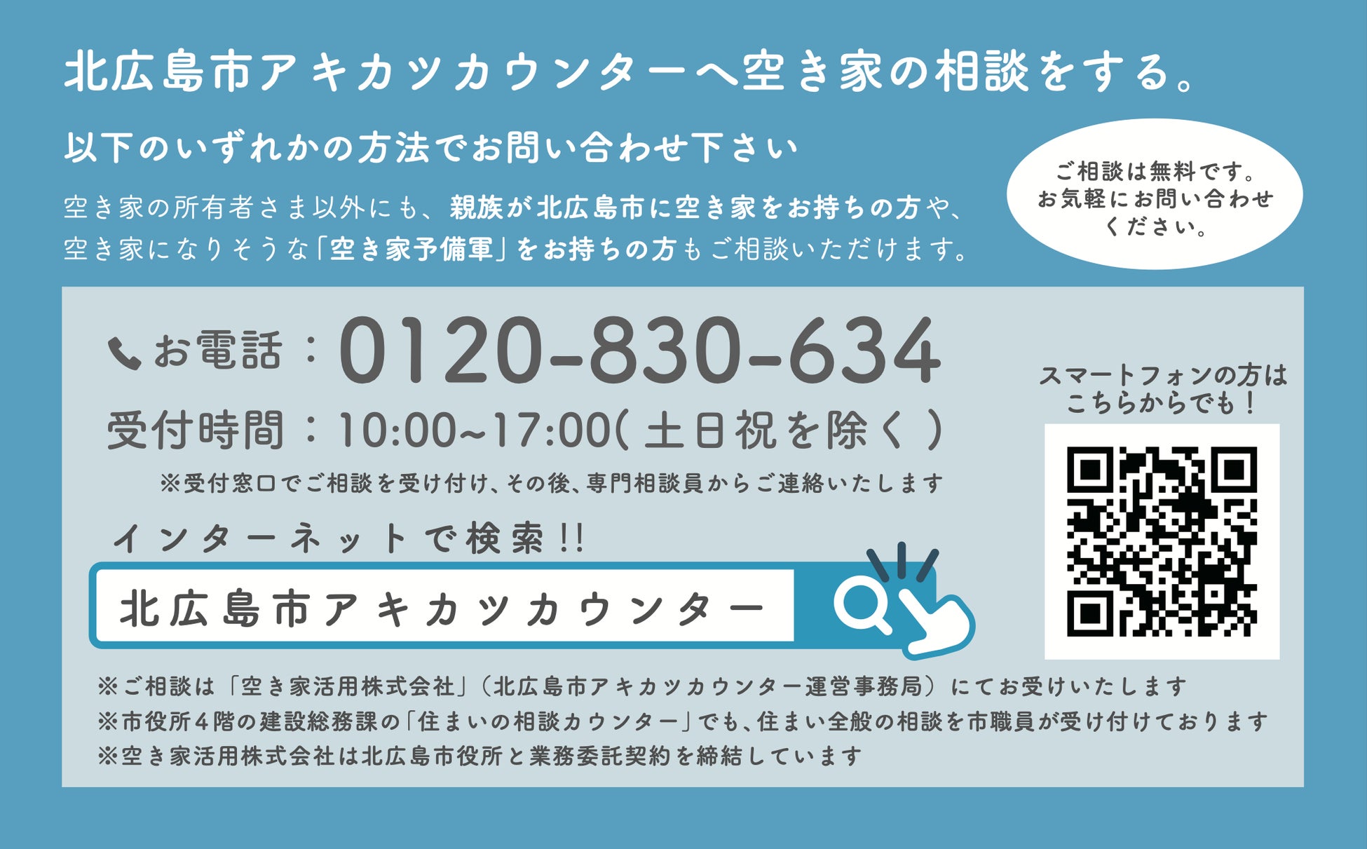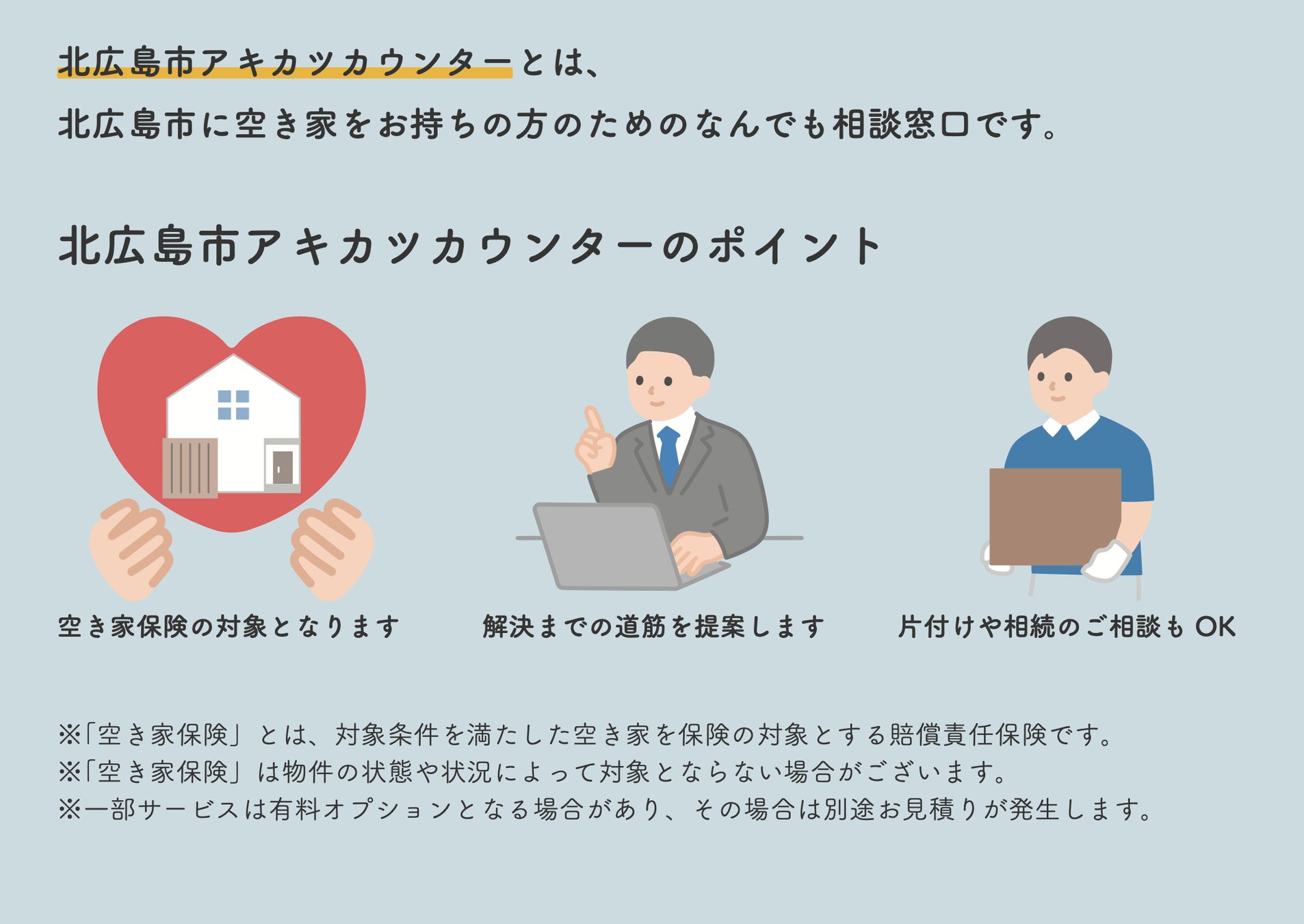 北広島市アキカツカウンターは、北広島市内に空き家を所有する方、同市内に空き家を相続される方、同市内の空き家の利活用を検討している全国の方のための相談窓口です。