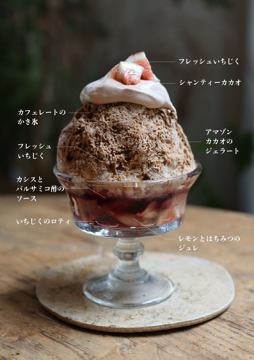 「無花果とカフェレートのパフェみたいなかき氷」は、カフェレートのかき氷とアマゾンカカオのジェラート、上品な甘味と酸味の無花果にカカオのクレーム・シャンティイ、さらには無花果のロティ、カシスソースとレモンジュレなどが何層にも重なり、ひと口ずつ食べ進めるほどに奥深い味わいと風味が広がります。「桃とカカオのパフェみたいなかき氷」は、アプリコットとバラのソースがアクセントになった、みずみずしくフレッシュな桃と爽やかな新茶のシロップを贅沢にかけたかき氷。