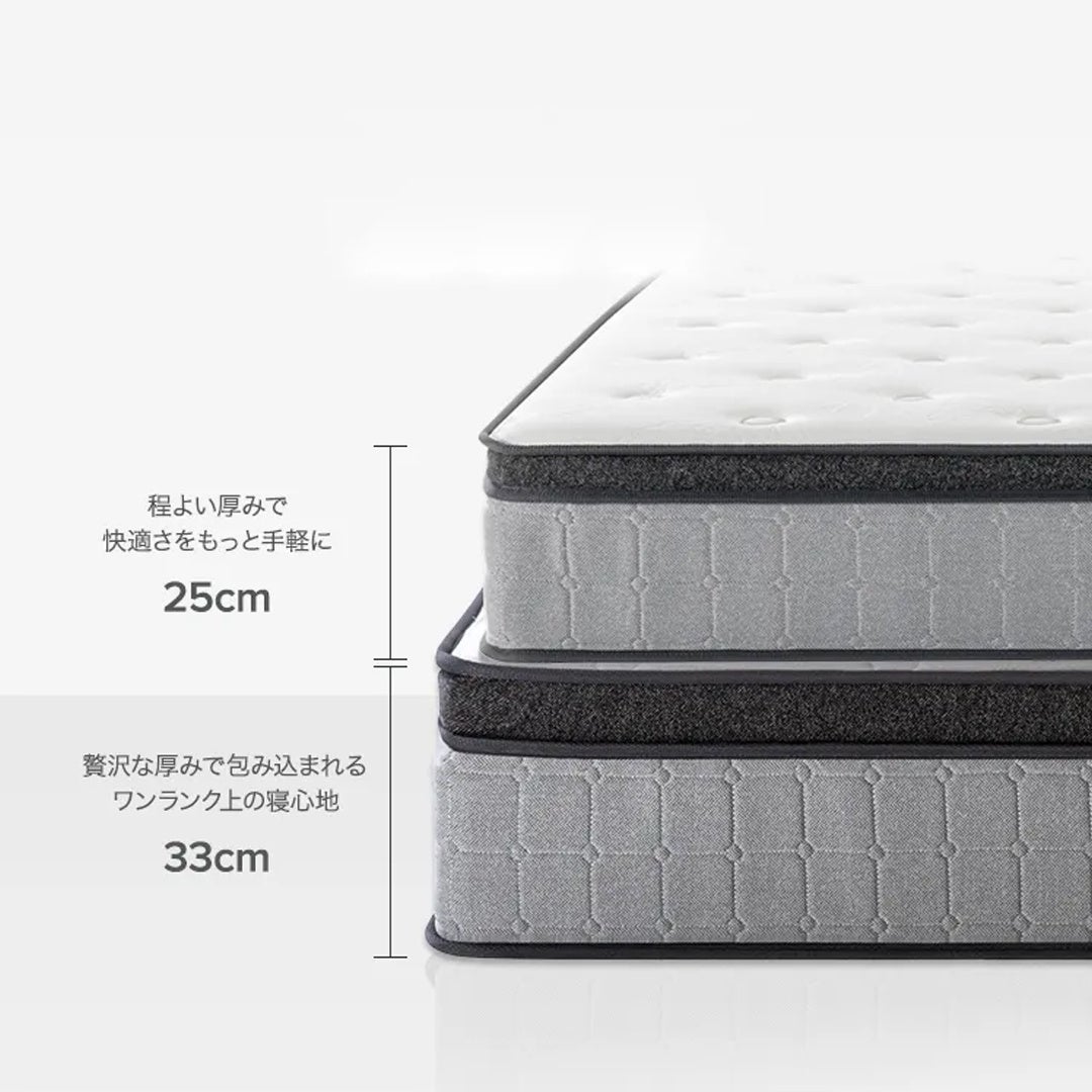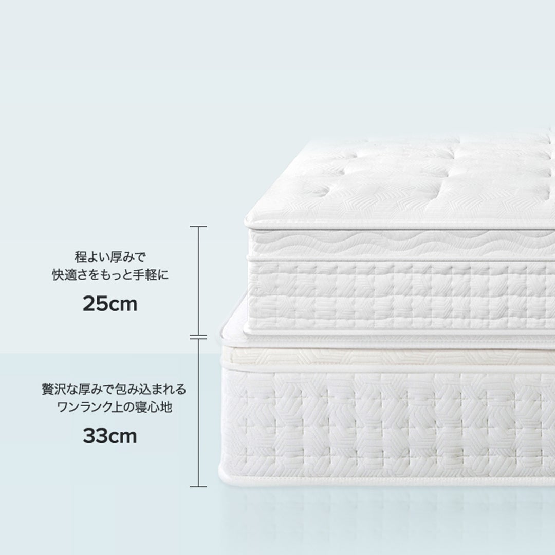 新たに追加された厚み25cmモデルは、日常使いに最適な設計。快適な寝心地を維持しながらも軽量化され、取り扱いやすさを向上しました。一方、厚み33cmモデルは、より贅沢な寝心地を求める方に向けたワンランク上の仕様。