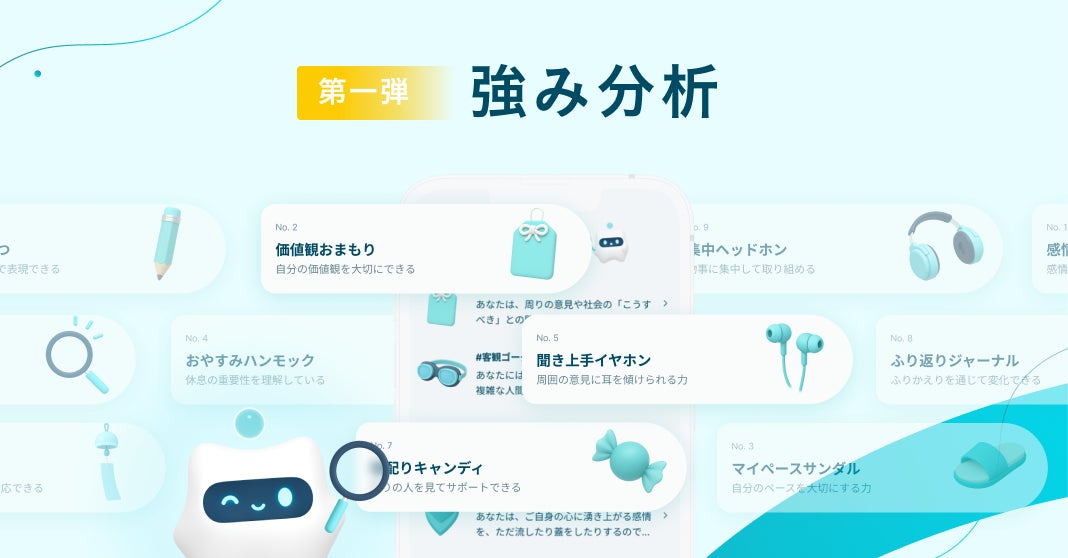 まずはじめに登場するのは「強み分析」。メンタル特化AI「ファイさん」が、ユーザーとの日々の対話の中から、ユーザー自身も気づいていない強みを見つけ出し、個性的なアイテムとして可視化します。一人では見つけづらい自分の強みを、ぜひファイさんと一緒に発見してみてください。