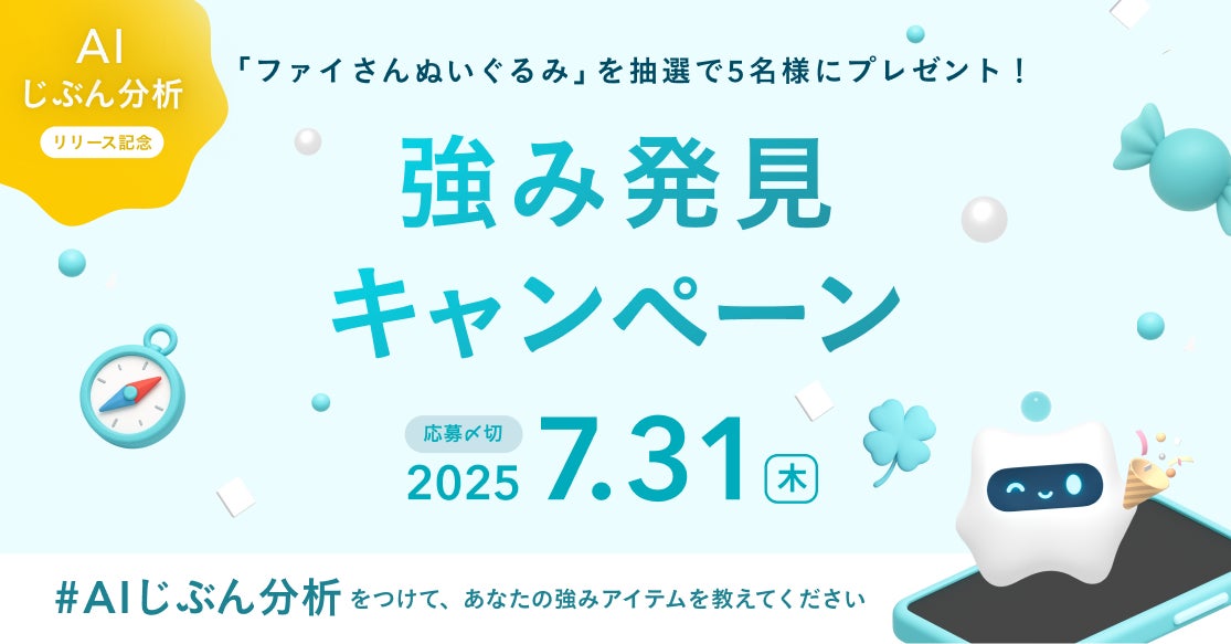 「AIじぶん分析」リリースを記念して、抽選で5名様にファイさんぬいぐるみが当たるキャンペーンを実施いたします。#AIじぶん分析 をつけて、あなたの強みアイテムをぜひXに投稿してください。応募締切は2025年7月31日(木)。奮ってご応募ください。