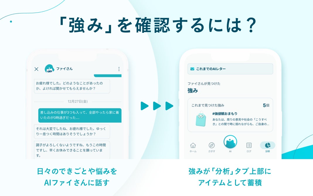 「AIじぶん分析」構想は、「悩むこと」そのものに価値を見出し、その瞬間を「自分を知るきっかけ」へと転換することを目指して立ち上がりました。ユーザーの皆さまがファイさんに明かしてくれた悩みや、感情、思考といった大切な記録をもとに、自分ではまだ気づけていなかった「じぶんらしさ」と出会える体験をお届けします。まずはユーザーさんが持ち合わせているポジティブな面に気づいていただきたいという思いから、第一弾は「強み分析」にしました。今後も、ストレスの原因、価値観、不調のサインなど、さまざまな切り口から「AIじぶん分析」を展開していく予定です。