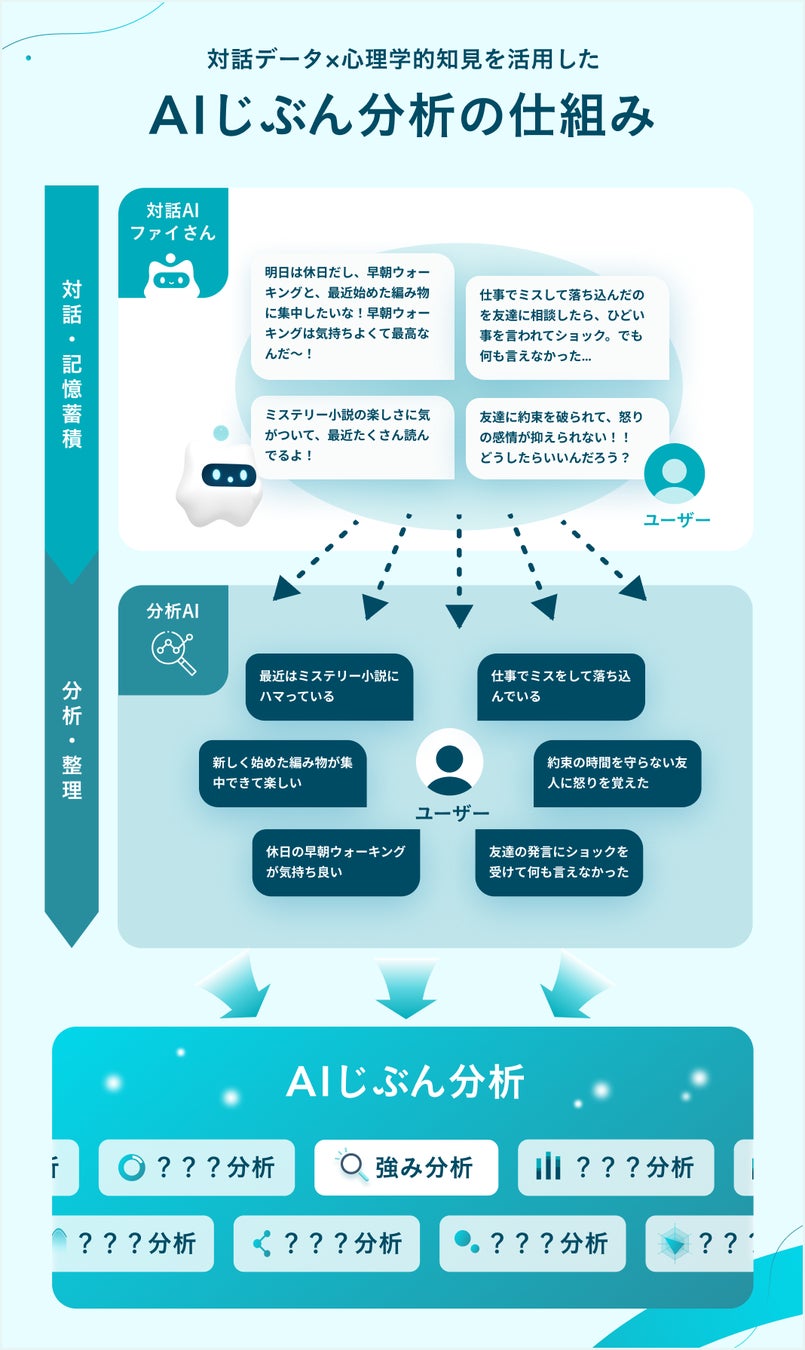 株式会社Awarefy(本社:東京都新宿区、代表取締役 CEO 小川 晋一郎、以下「アウェアファイ」)は、2025年7月11日(金)、AIメンタルパートナー「アウェアファイ」アプリにおいて、チャットログをAIが分析し、そこに表れるユーザーの強みや思考のクセ、ストレスの原因などを可視化する新機能「AIじぶん分析」の提供を開始いたしました。