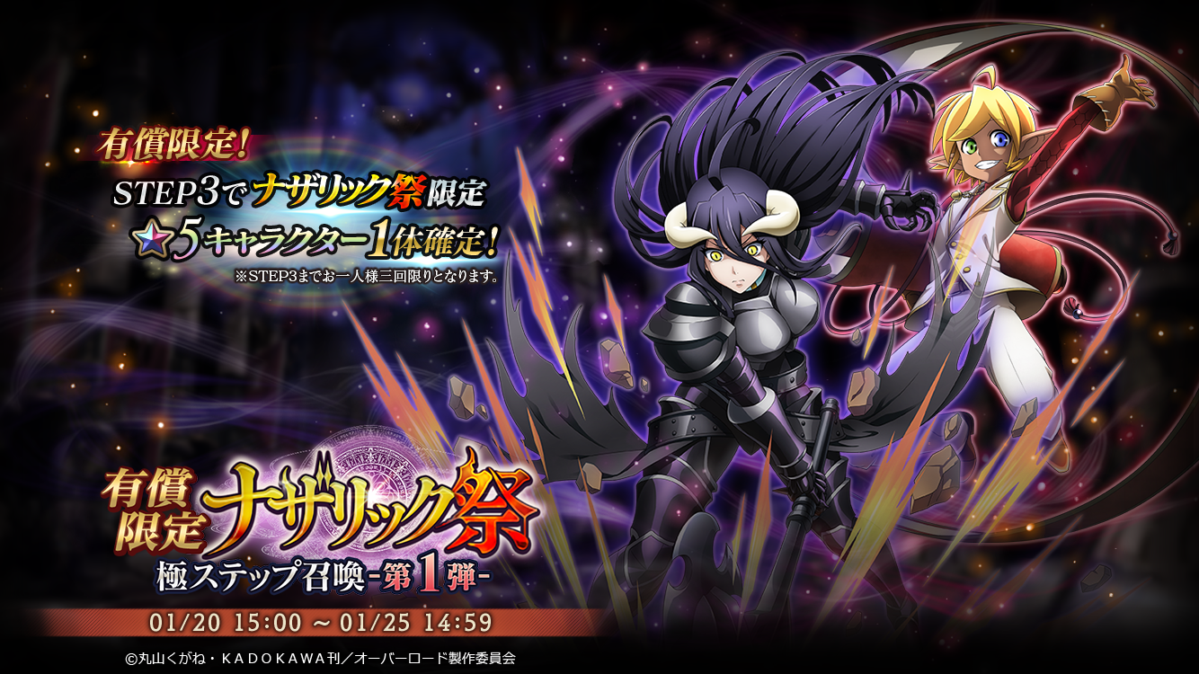 1/20よりイベント召喚『ナザリック祭 極ステップ召喚 -第一弾-』、1/25より『ナザリック祭 極ステップ召喚 -第二弾-』を開催!★5キャラクターが確定する貴重な召喚となり、「【名調教師】アウラ」や「【絶死絶命】番外席次」などがラインナップに登場いたします!