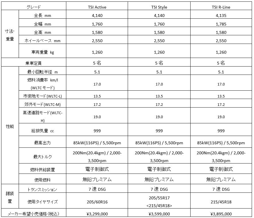 グレードは、”Travel Assist”やレーンキープアシストシステム”Lane Assist”など最新の運転支援システムを標準装備とした『TSI Active』をエントリーグレードに設定し、LEDマトリックスヘッドライト“IQ.LIGHT”や運転席/助手席のシートヒーターを標準装備した『TSI Style』、そして専用エクステリアを身に纏い、専用シートや18インチアルミホイールを装着した『TSI R-Line』の3グレードを展開しています。