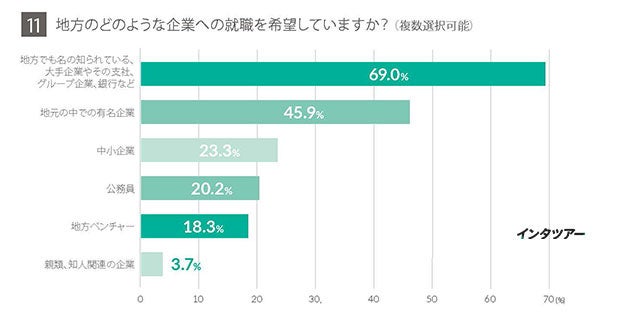 最も多かった回答は、「地方でも名の知られている、大手企業やその支社、グループ企業、銀行など」69.0%となりました。続いて、「地元の中での有名企業」45.9%が多数となりました。コロナ禍を受け、学生の就職希望が大手・安定志向になっているといわれていますが、地方就職でも同様の傾向にあるといえます。また、「公務員」20.2%志望も多く、地方自治体への就職も選択肢に入っていることが分かります。