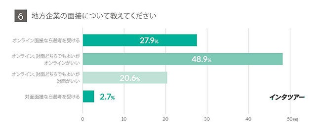 実際に、この設問の最も多い回答は、「オンライン、対面どちらでもよいがオンラインがいい」48.9%であり、「オンライン面接なら選考を受ける」27.9%を合わせると76.8%が地方企業の面接を受ける際にオンライン面接を希望していました。