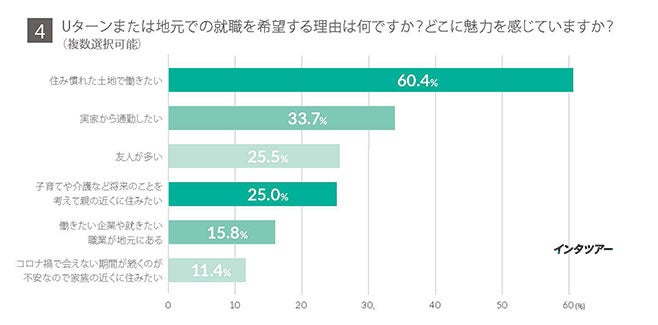 最多の回答は「住み慣れた土地で働きたい」60.4%、次いで「実家から通勤したい」33.7%が上位となりました。また、「友人が多い」25.5%、「子育てや介護など将来のことを考えて親の近くに住みたい」25.0%なども回答が多く、一方で「働きたい企業や就きたい職業が地元にある」は15.8%にとどまっています。