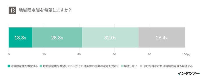 しかし、就業地を固定できるなら地域限定社員を受け入れる回答としては、「地域限定職を希望する」13.3%、「地域限定職を希望しているがその他条件の企業の選考も受ける」28.3%、「やむを得なければ地域限定職も希望する」32.0%といった結果となり、合計73.6%と見ることもでき、消極的でありながらも選択肢になり得ることが分かります。